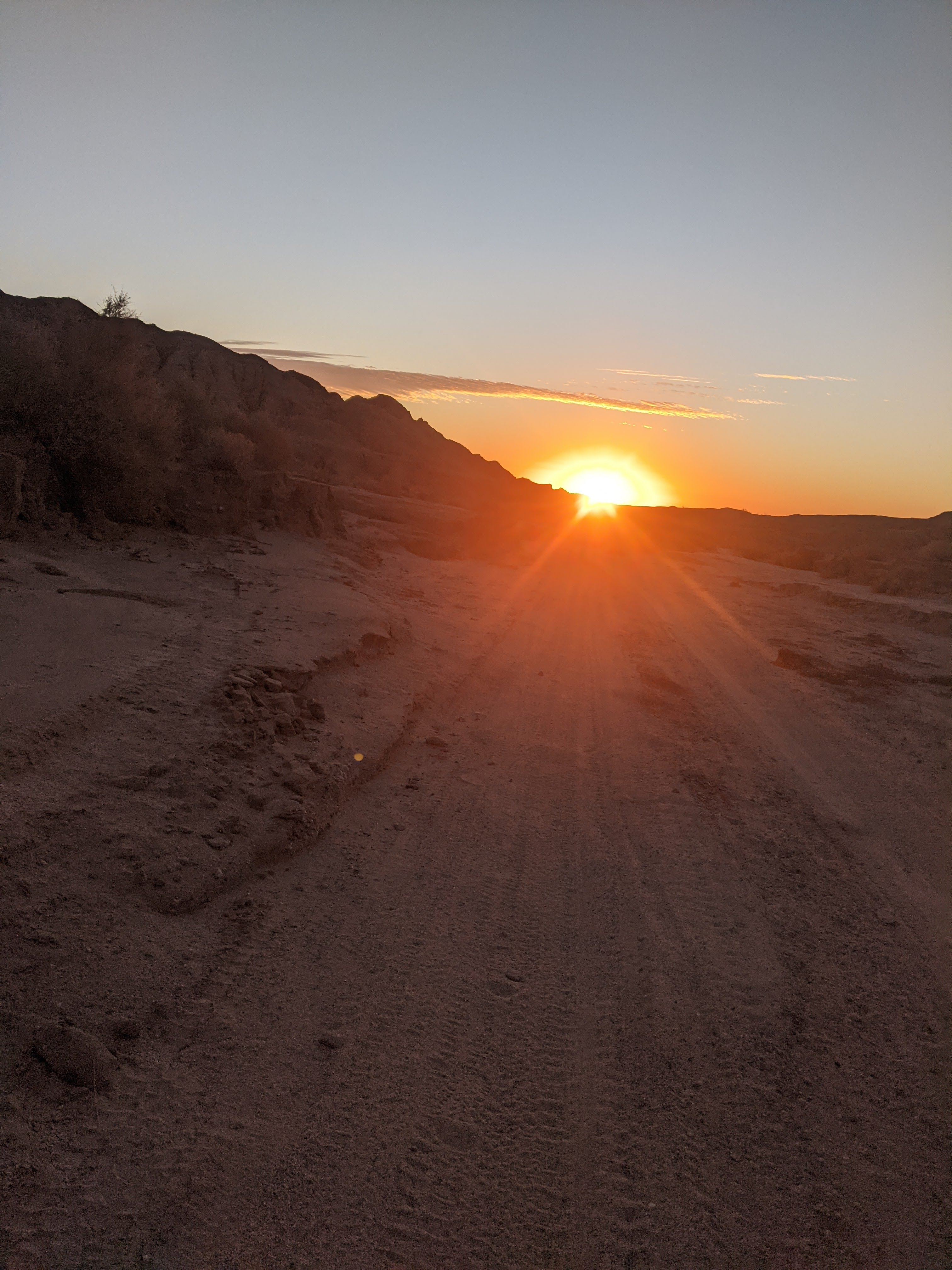 Today I started hiking the San Diego Trans-County Trail, from the Salton Sea to Torrey Pines. Today I set off just after 11am, after caching water in a couple places on the drive out. The first 19 miles are along Arroyo Salada, a wash that’s also an OHV route. Starting late morning, the sun was full on but as the shadows lengthened, the temps began to drop. I spooked two jackrabbits, they raced across the desert floor ahead of me. I also saw a Killdeer in a fenced off area with standing salt water. Dinner was cold soaked re-fried beans and couscous with some green chili spice on it. Delicious! After the sun set I hiked for a few hours, barely needing a headlight.