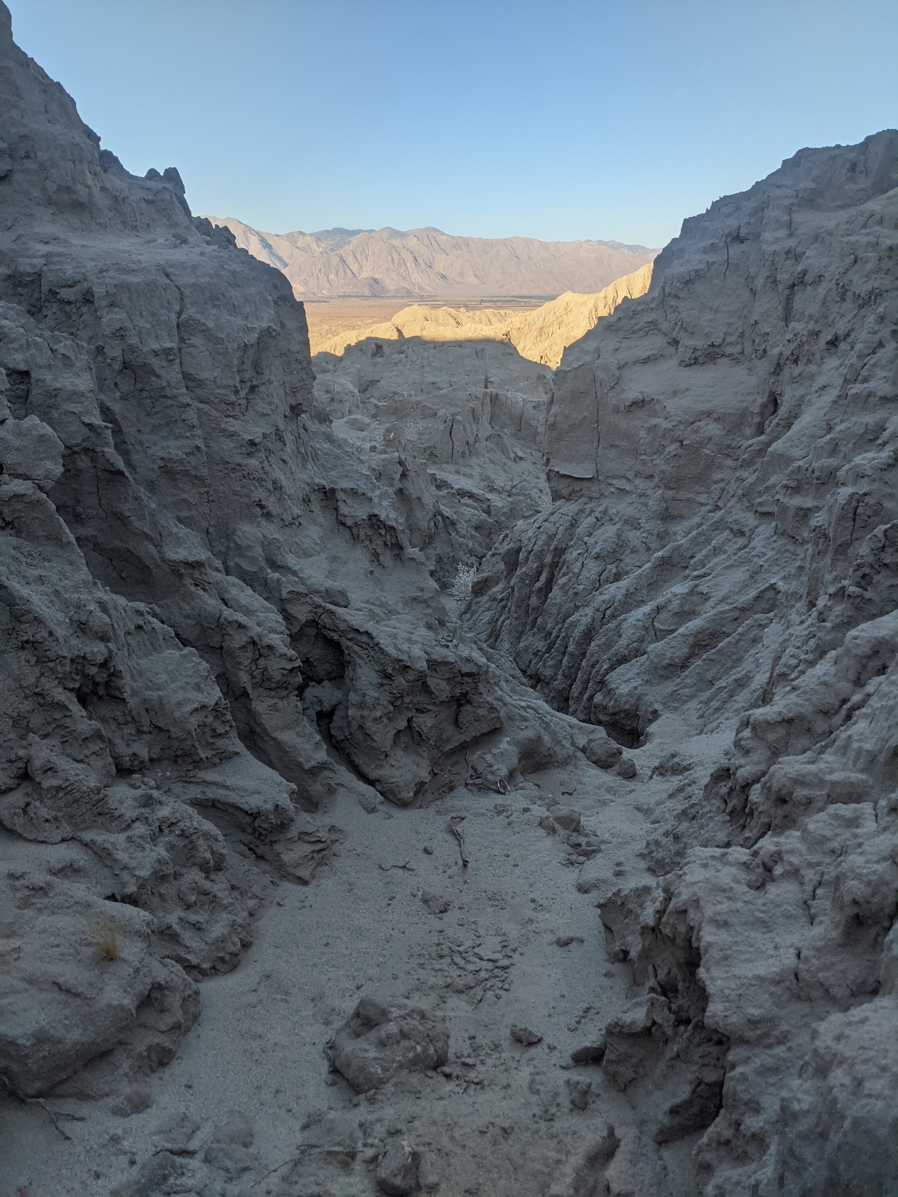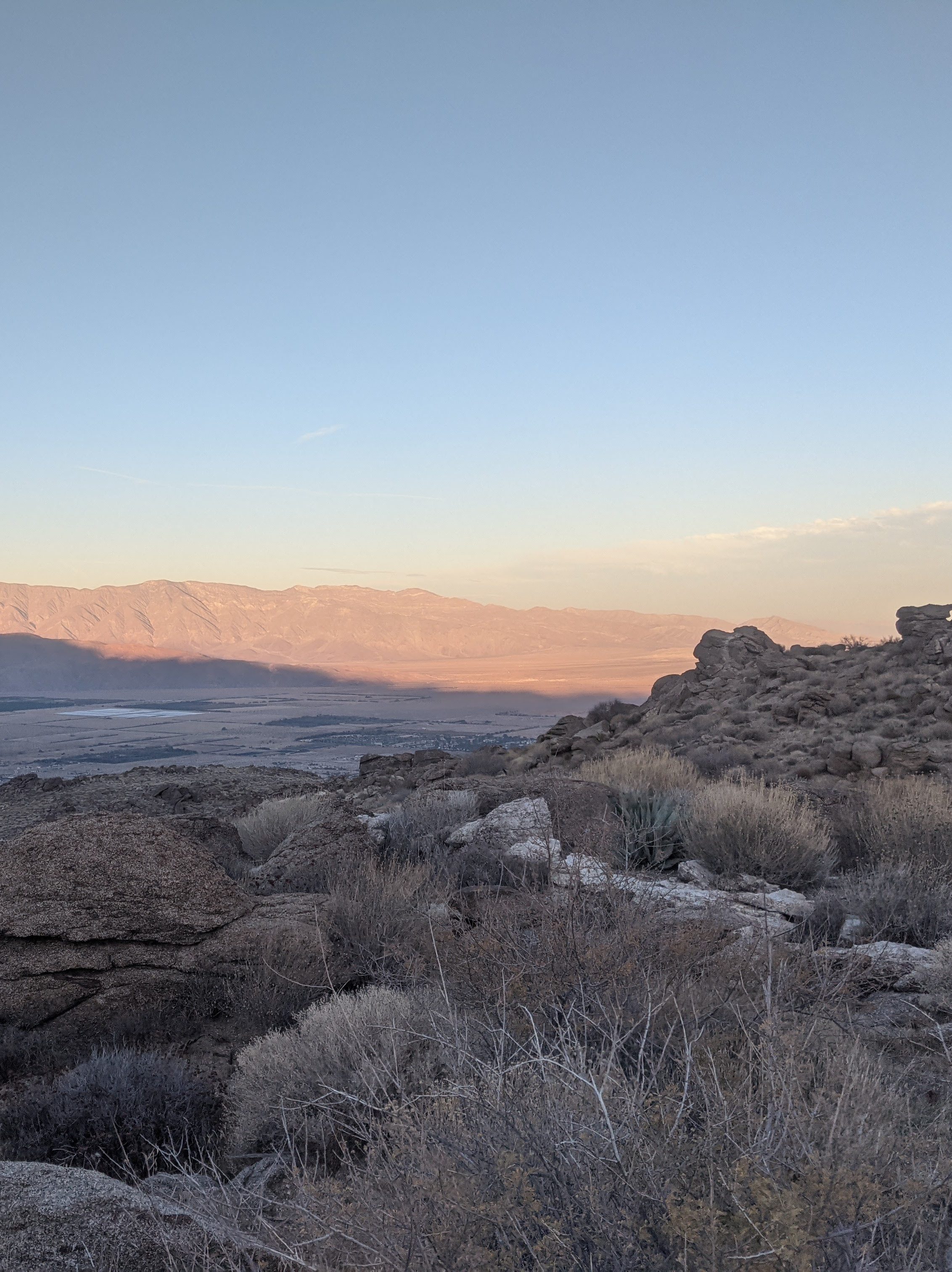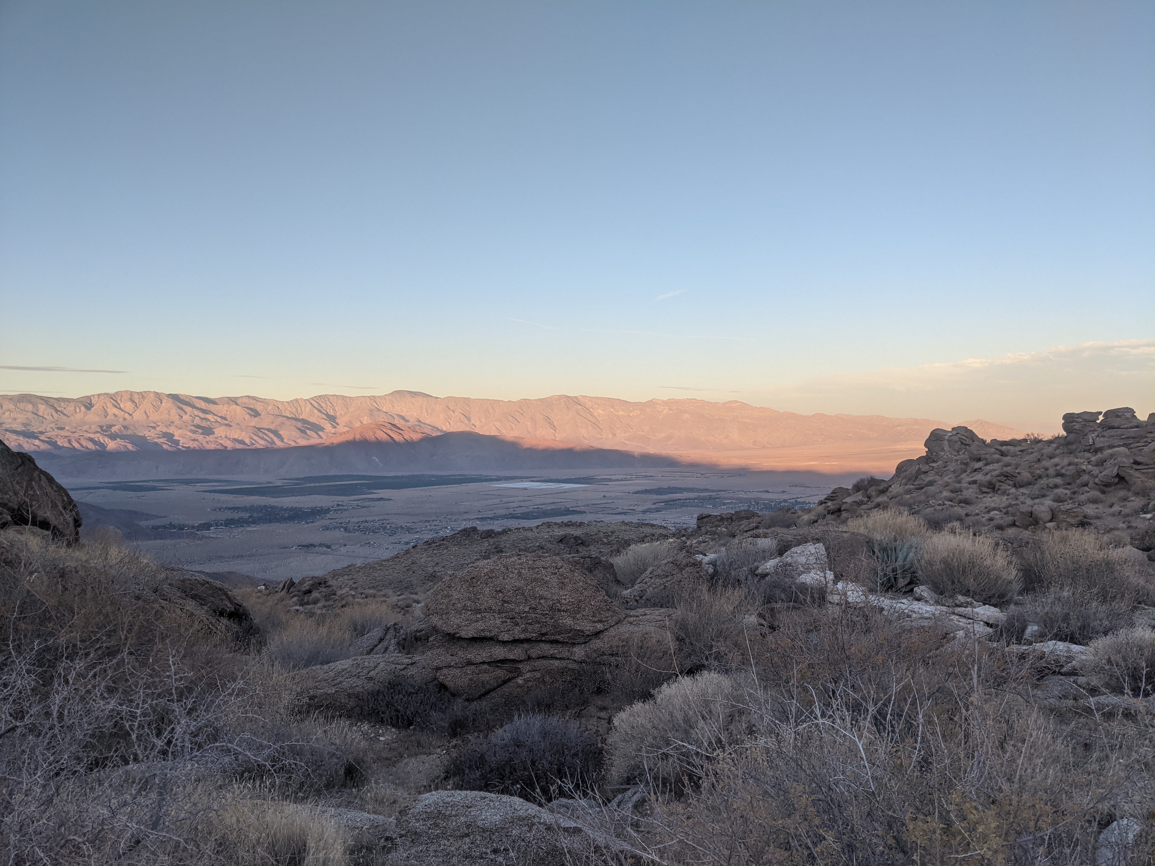 Last night I slept on the side of a sandy wash. I woke up with the sun and was hiking shortly after the sunrise. As dawn broke, cool temps and a light breeze kept me happy while I enjoyed the morning colors. The trail was mostly wash, and unfortunately not easy walking as it was well traveled by vehicles, making the sand soft. There was a cool section where I meandered down a mud ravine (pictured) while crossing drainages to a new wash. The wash led out to a paved road and I hiked on the shoulder for 5mi into Borrego Springs where I recharged my phone and drank lots of water at the very welcoming visitor center. Begrudgingly, I shouldered my pack for the 3,500ft climb out of town in the heat of the afternoon. After a hot hour or so, I found myself in the shadow of the mountain off to the west. I played peek-a-boo with the sun until it set, when I had great views looking back east, down over town and all the way to the Salton Sea. I clicked on my headlamp when it got dark and ended spotting two foxes up ahead just off trail, I believe one was a juvenile. After a few hours of night hiking, I found a flat enough spot to sleep for the night.