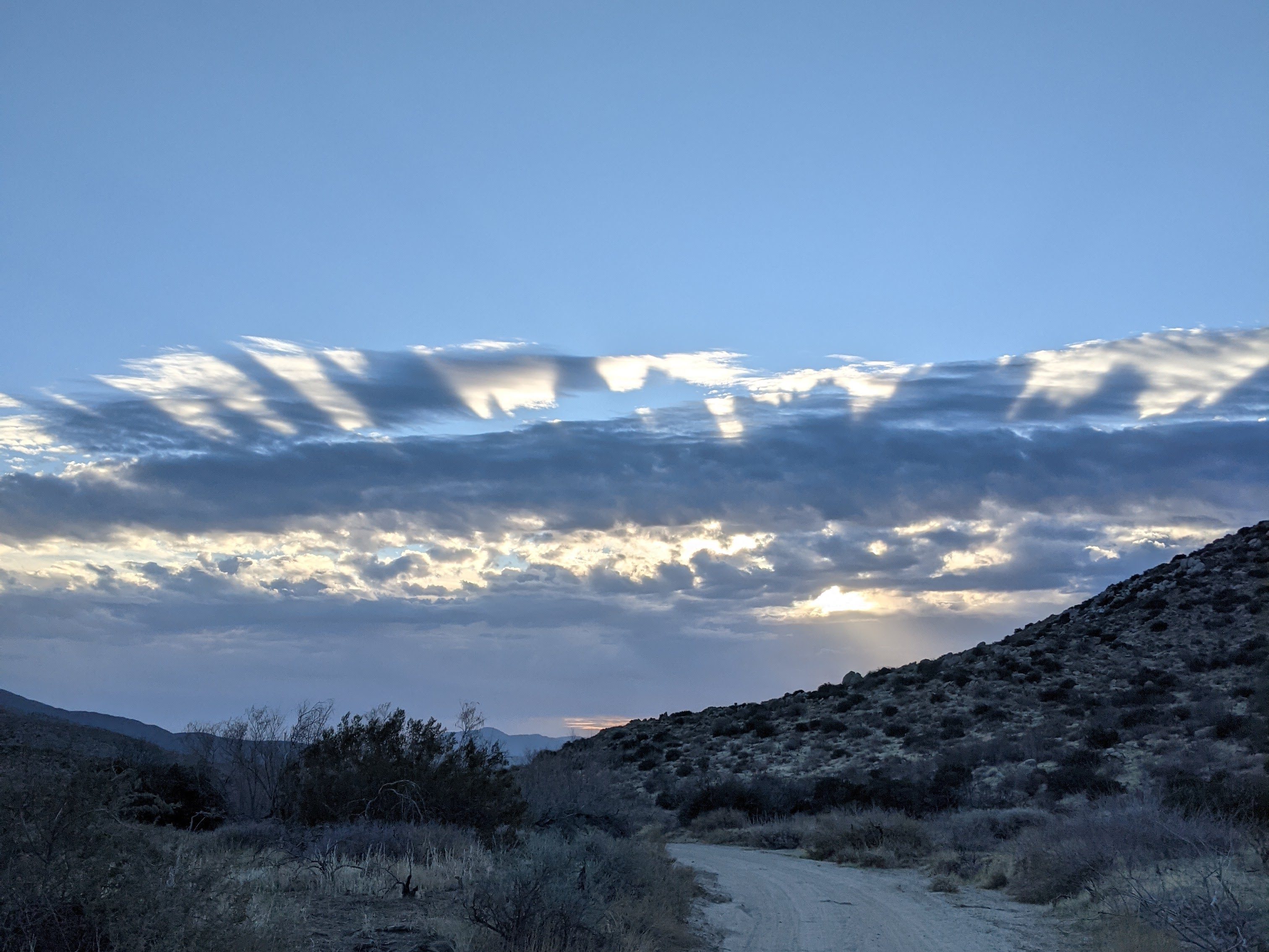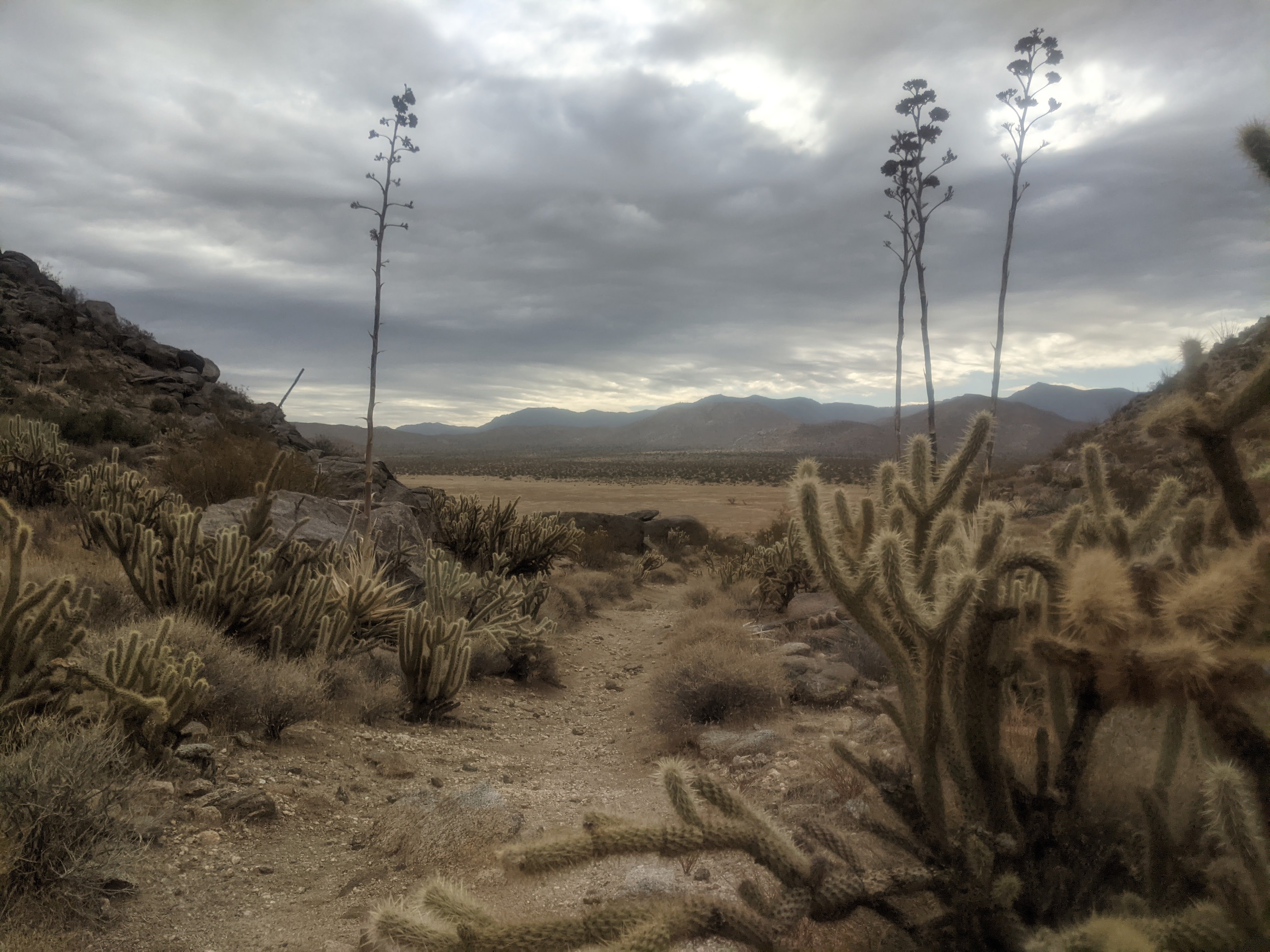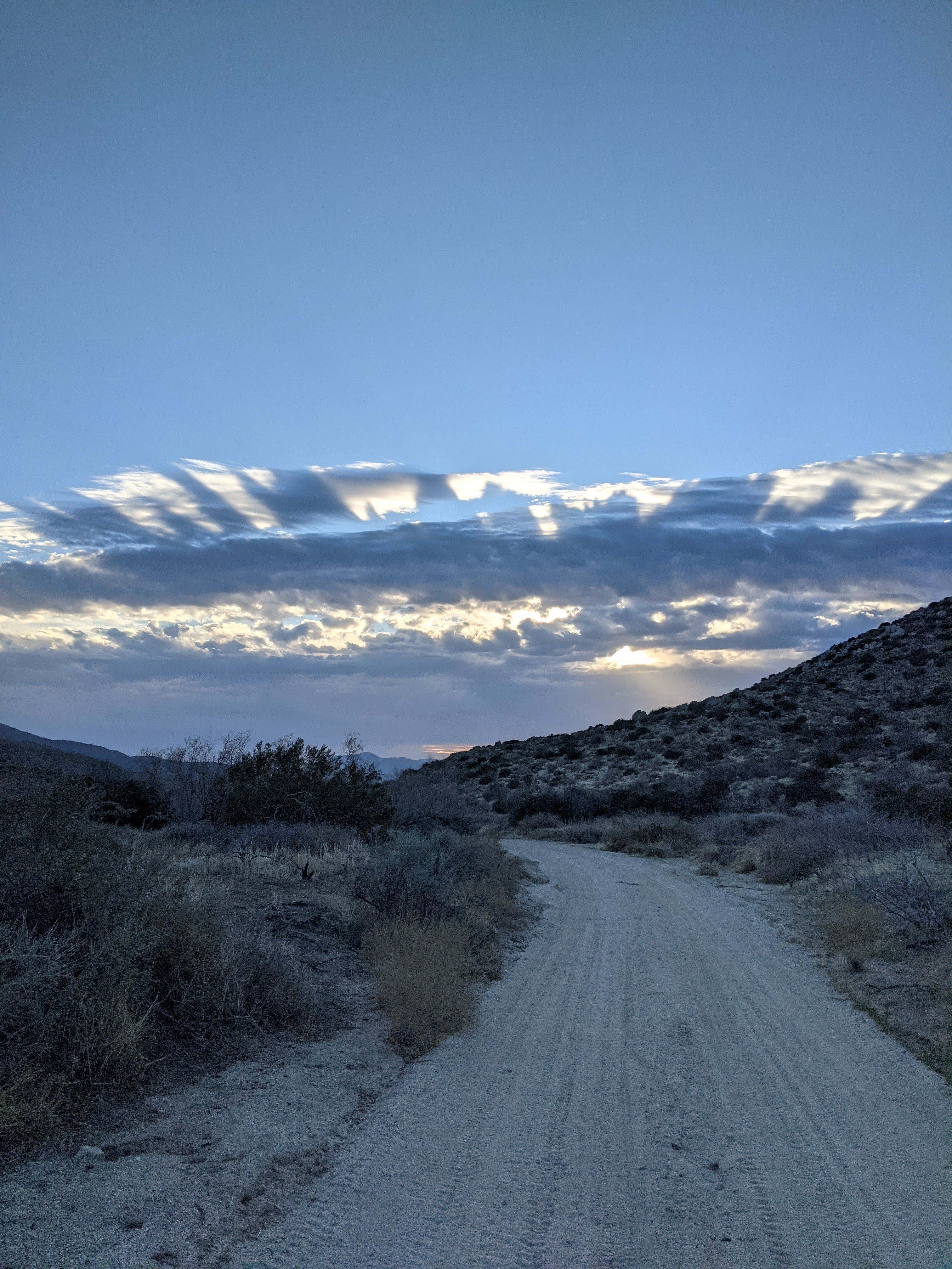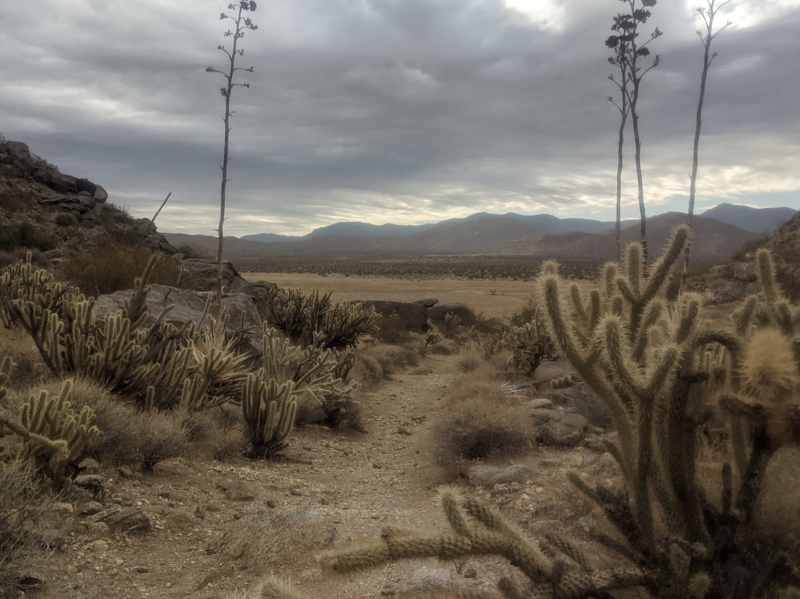 I woke up after a cooler-than-expected night and walked with my layers on as the sun broke out of the clouds. This section of the trail was contiguous with the CA riding and hiking trail as it meandered through Grapevine Canyon and the culturally important Angelina Springs. While hiking, I spooked a number of flocks of quail- sorry hunters! I picked up my water cache and took off. The overcast morning and lower temps allowed me to carry for over 20mi, skipping a detour to refill. While walking up a wash, I said hello when I crossed a day hiker, the only person I spoke to for over 30hrs. Eventually the wash ended and there was a beautiful view looking up towards the Laguna Mountains with the lonely desert highway, S2, below. I navigated back into another wash for a few miles before crossing the highway and starting to climb up. I found myself ascending the same path that I had descended a decade or so ago when on my first backpacking trip. As I climbed out of Oriflamme Canyon, I contemplated continuing on. In truth, I was tired and sore and had been cold all day. What would be the usual aches and pains of hiking seemed to be larger today than in the past, possibly something I purposefully forgotten. As I crossed the PCT, on the eastern ridge of the Lagunas, the wind picked up big time and it became clear to me that I was physically exhausted, in more pain than enjoyment, and had been cold all day. My dad picked me up a couple hours later, just past the halfway point of the trail and I slept in my bed at home last night. A day later, I am struggling to accept that I took the easy option out simply because I was cold, my feet hurt, and I was simply not enjoying the trail like I thought I would.