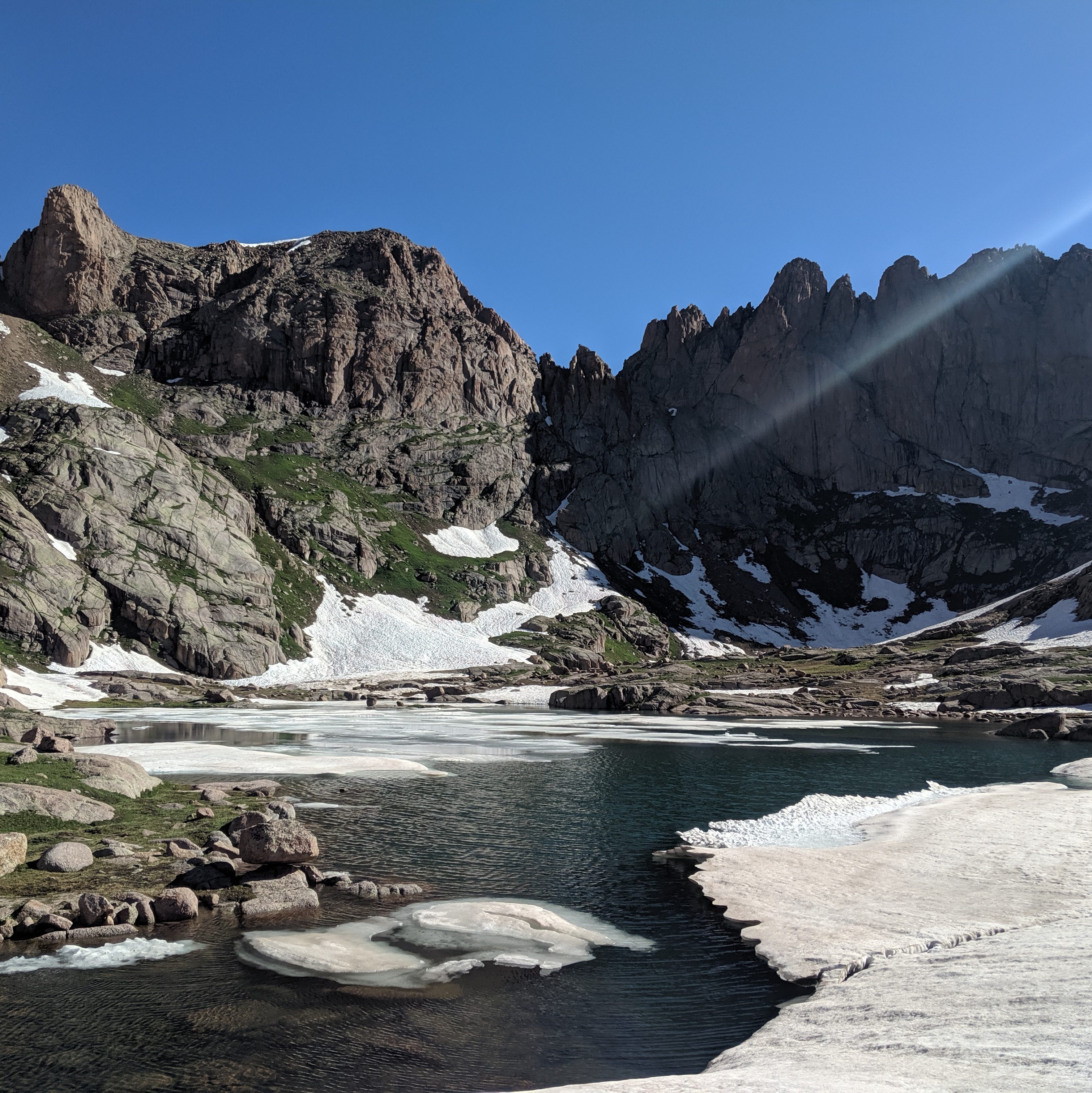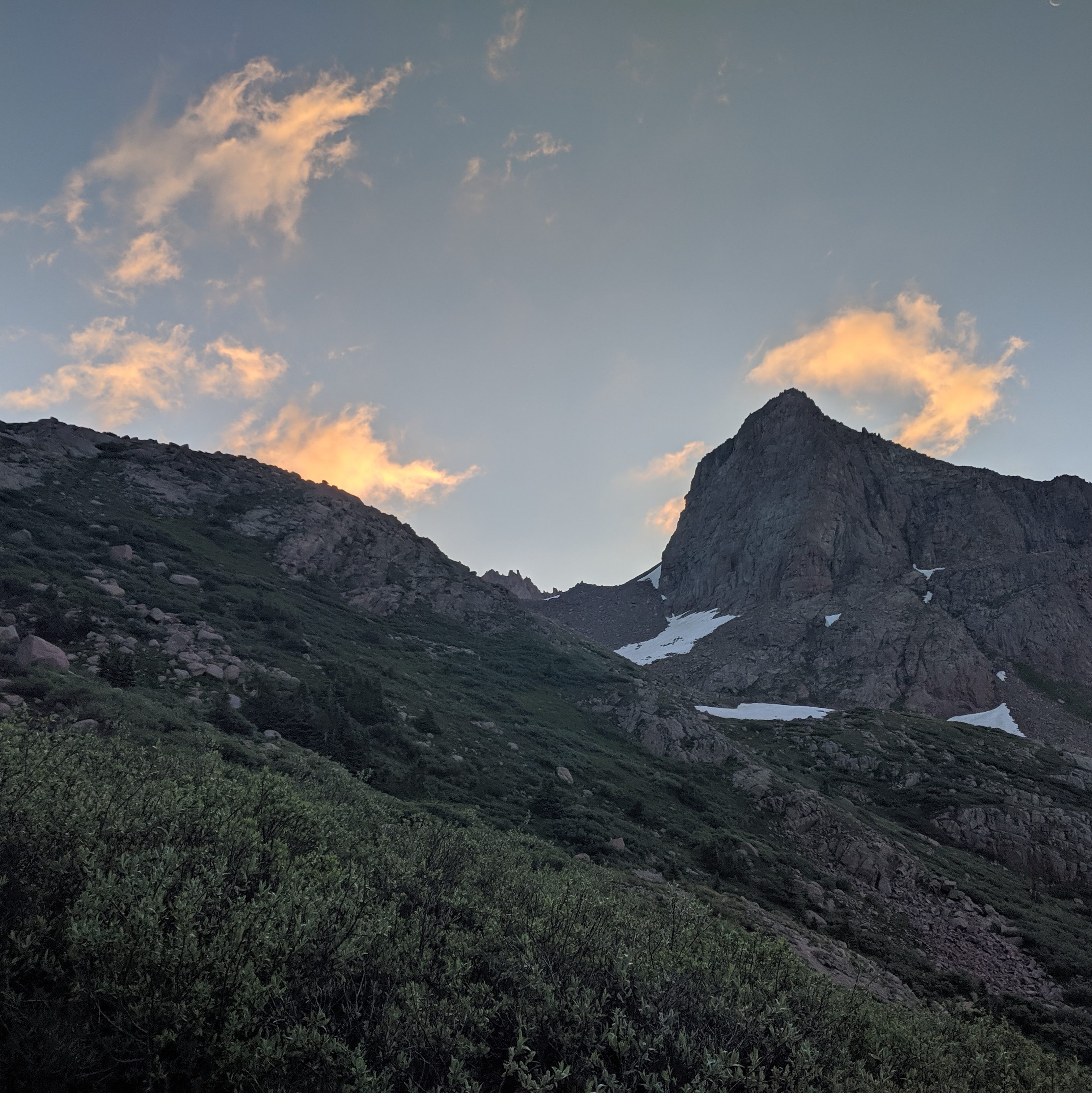 I was feeling fit from a busy summer trying to climb the remaining 14ers before moving to New Hampshire for school. I had been eyeing an ambitious do-it-in-a-day route that was on the edge of what I thought I could do. Paying close attention to the weather the weeks prior, I was waiting for a window of stability on a day off from work. Then, in the last few days of July, things started to line up- stable weather, workable snow levels, confidence in route choice, and a strong fitness base. After work I booked it down to the trailhead just north of Durango, pulled the curtains in my car, and tried to fall asleep around 8pm. Just after midnight my alarm went off and it was go-time! I drank some water, chugged as much coffee as possible, grabbed my pack, and crawled out of my car. The hike started cool, with the initial trail descended 1000 ft down to the Animas River, I knew that was going to be a bummer hiking out of. I spent the next 5 hours hiking with only a headlamp on until I started to reach the beginning of the Chicago Basin. I awoke a deer, spooking me, as it took off running through the bushes. Around 4am or so I thought I was hearing voices just off trail, so I looked around. I think it was just a gurgling stream but I hustled outta there quick!