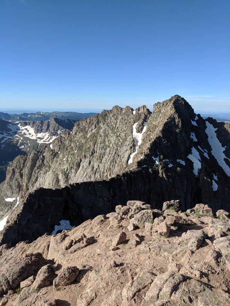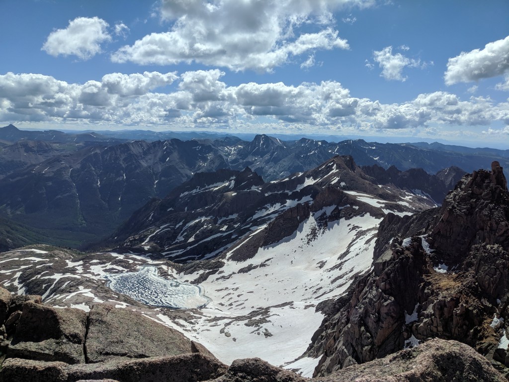 Then it was time to descend back down to the upper-upper basin, cross it, and climb Windom’s more gradual west ridge. I had saved the least technical ascent for last. Exhaustion began to creep in. I focused on putting one foot in front of the other. Summit! Eat. Drink. Take a photo. Okay time to go, I have a long way back.