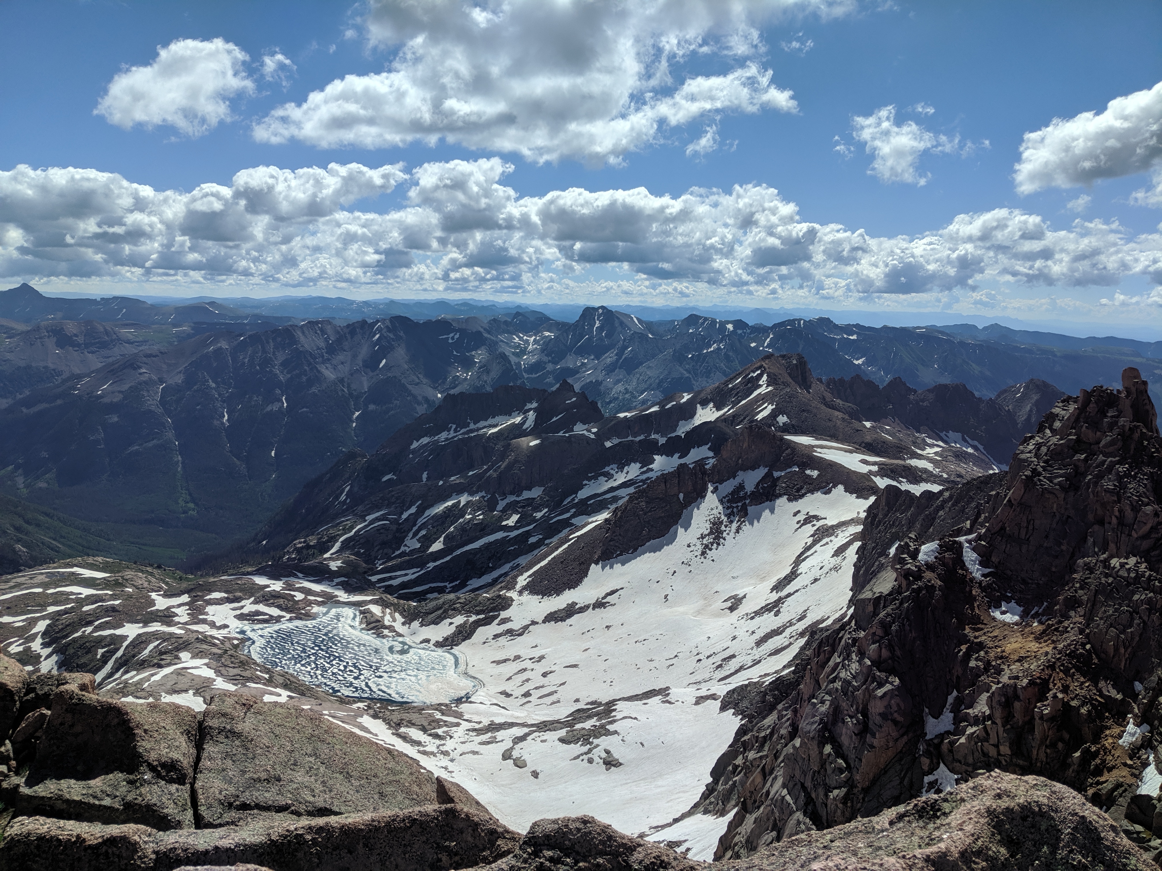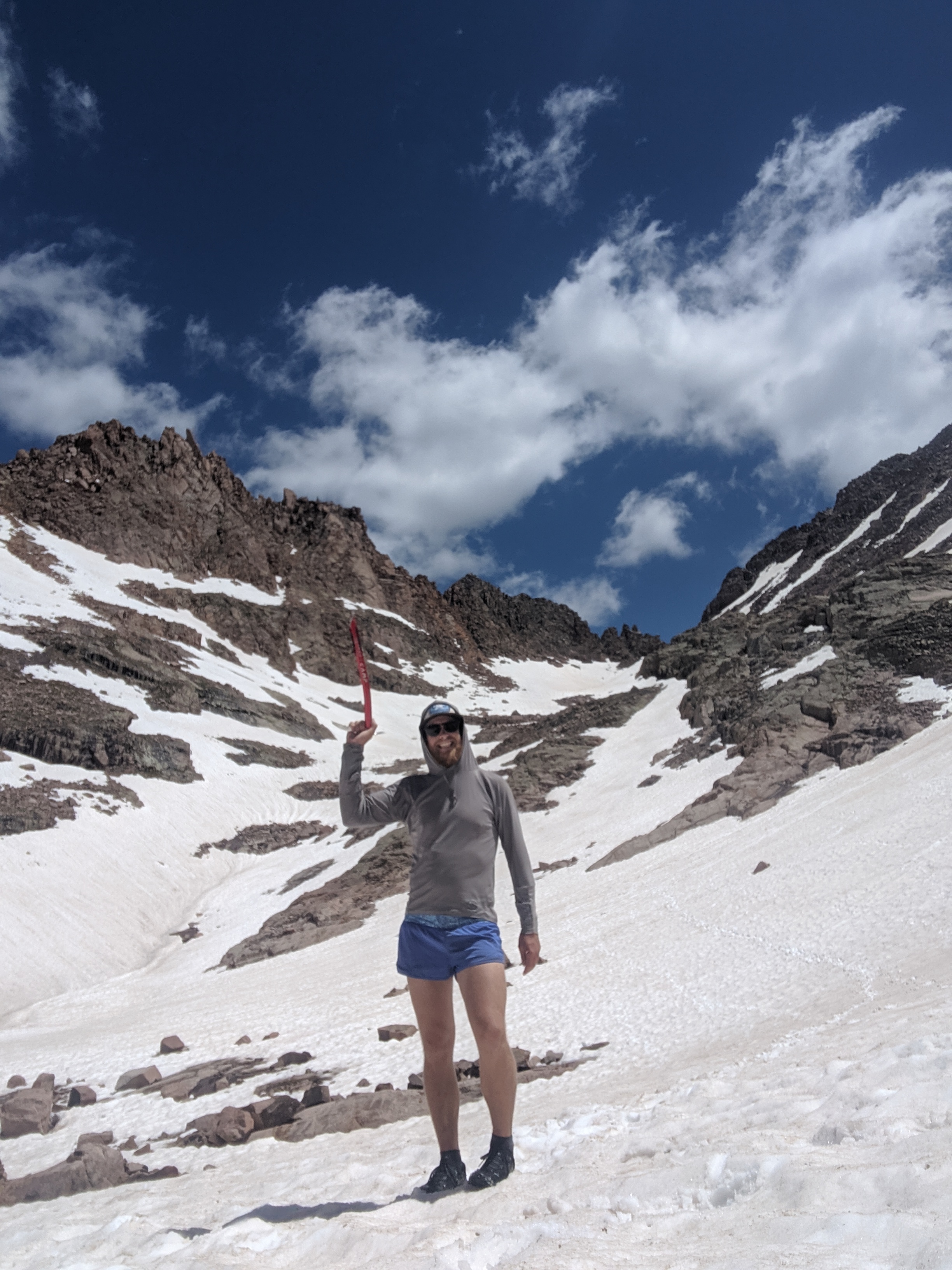 First up was Mt. Eolus, named after the god of wind. Shortly upon entering the upper cirque, I encountered snow and ice. I donned my trusty microspikes, pulled my axe off my pack and started the traverse west to the gully up to Mt. Eolus’ NE ridge. The travel was going smoothly with an enjoyable Class 3 scramble to the summit. I met a small group with a guide, briefly explained what I was up to, then hurried off to North Eolus. Eolus must have been wreaking havoc elsewhere because the morning was pleasant with only a light breeze. I descended back to the upper cirque, crossed the largely-still-frozen lakes and passed under Peak Eleven and the Needle Ridge en-route to Sunlight Peak. The snow was supportive yet soft enough to yield traction. I climbed up the south face of Sunlight, switchbacking east then back west until I was on solid rock. I found the last couple hundred yards to the summit a fun puzzle to the summit. Upon the summit there were two guys from Texas. We talked about what may be the most interesting summit of the entire 58 fourteeners- a large boulder balanced up high with plenty of airy exposure needed to stand atop it. They took a photo after I scampered up.