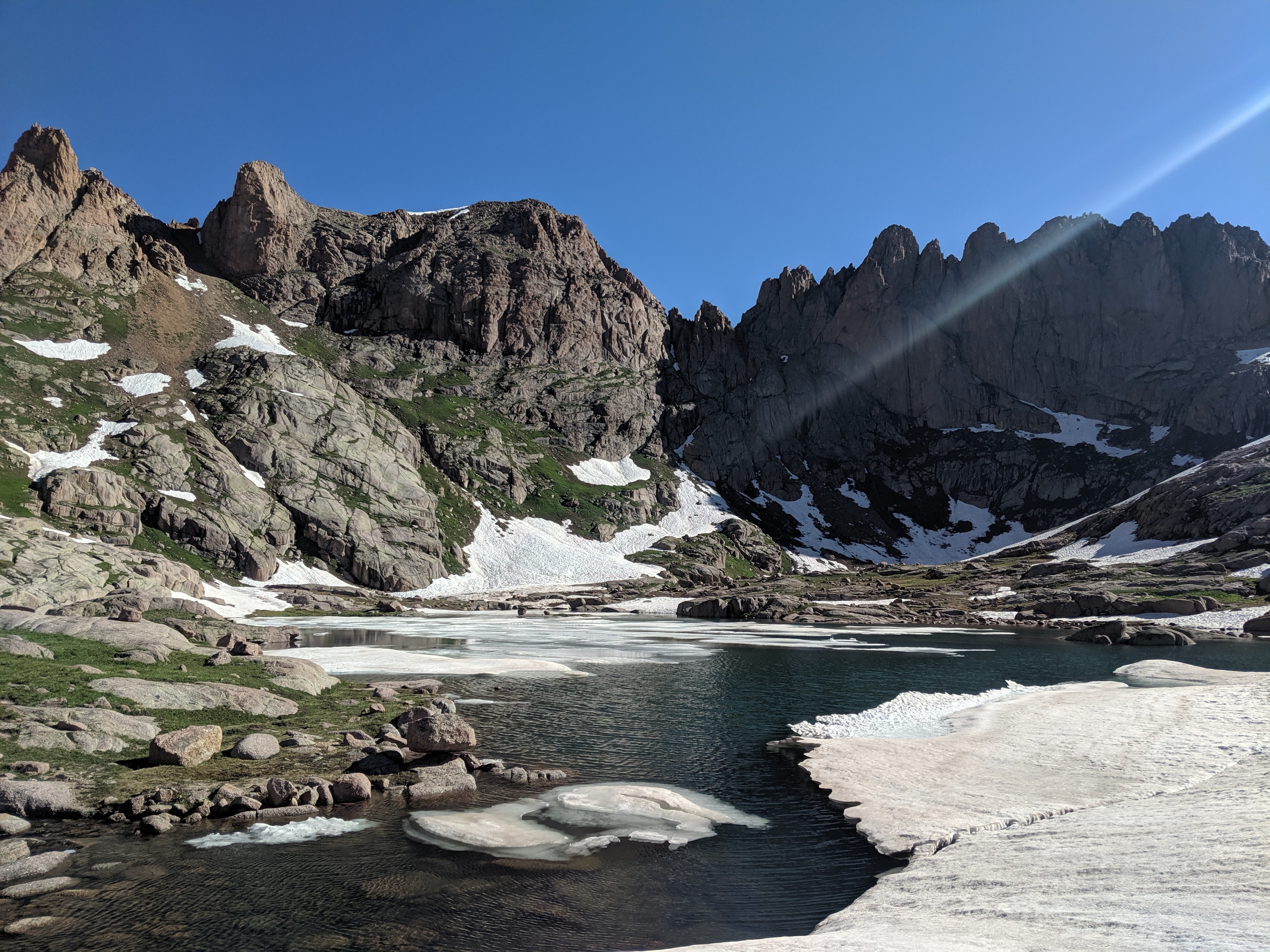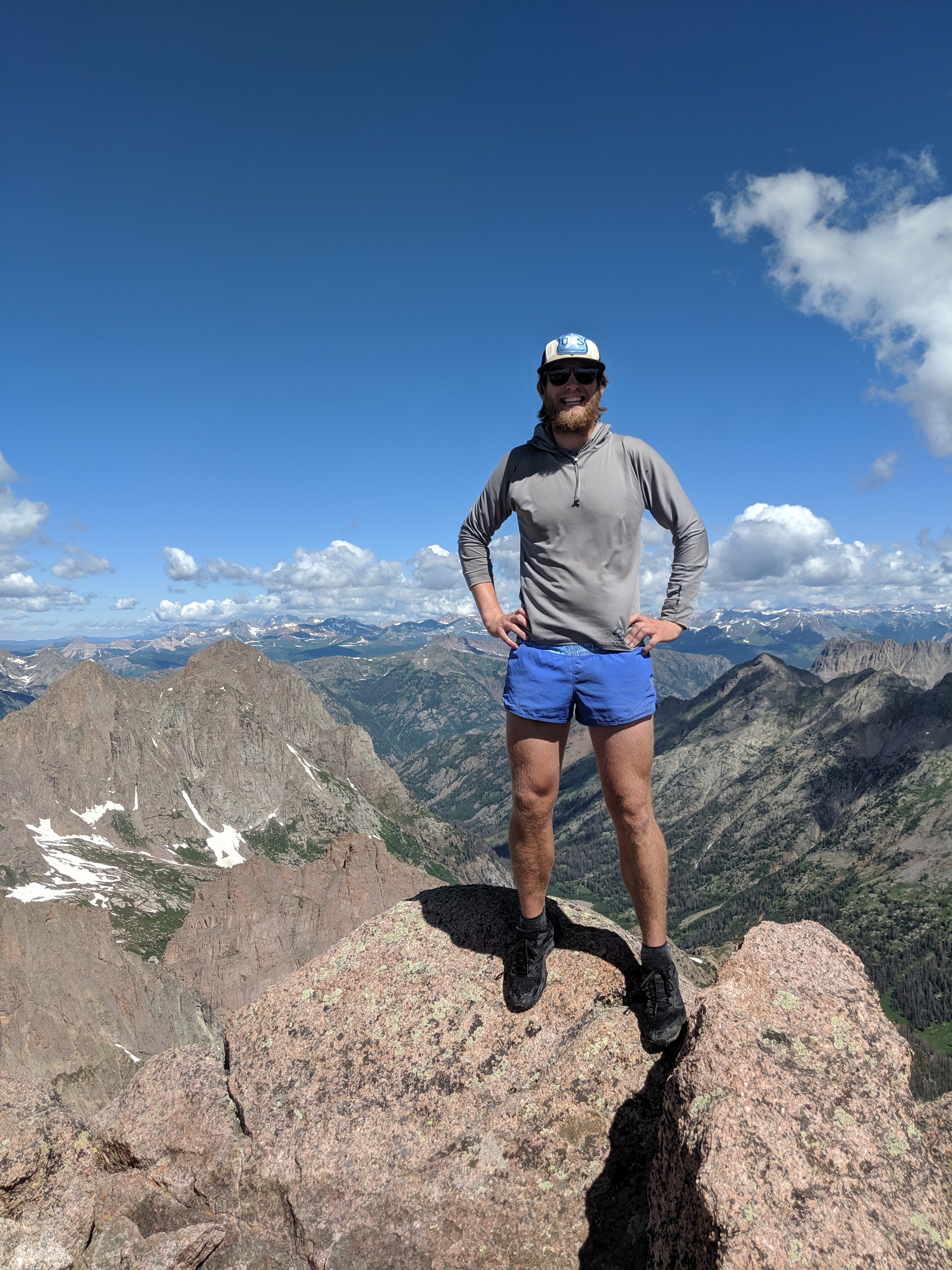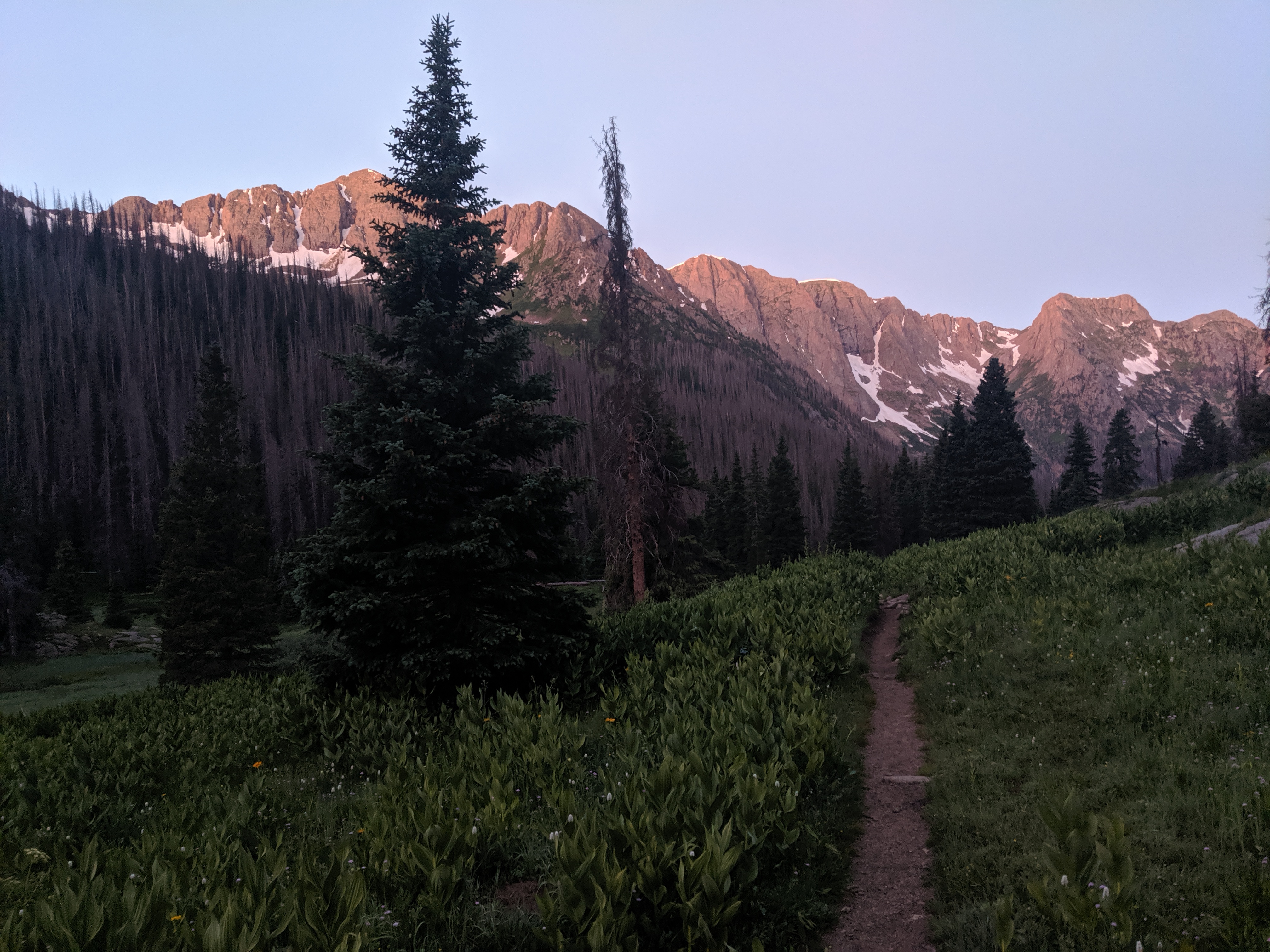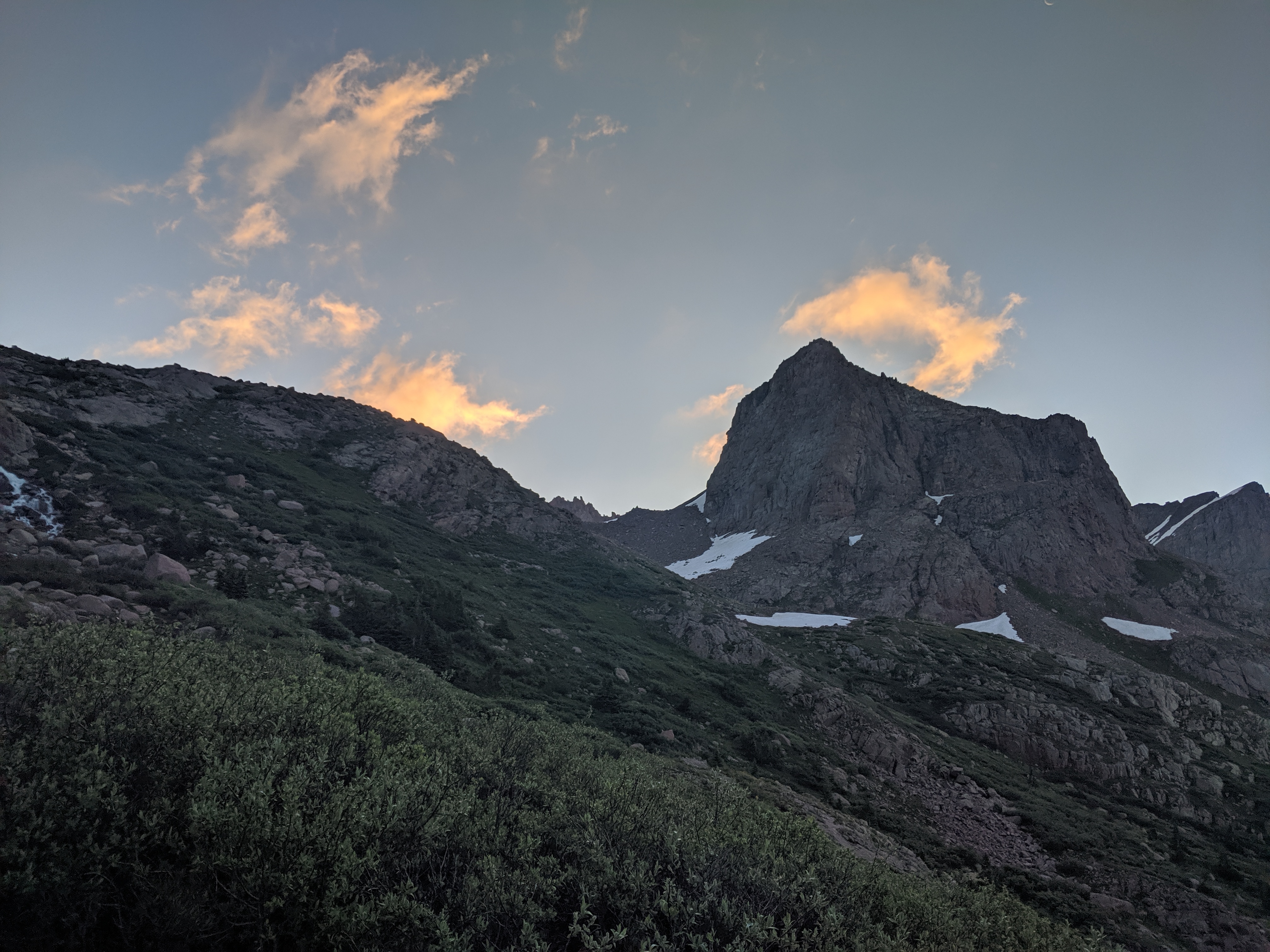 I was feeling fit from a busy summer trying to climb the remaining 14ers before moving to New Hampshire for school. I had been eyeing an ambitious do-it-in-a-day route that was on the edge of what I thought I could do. Paying close attention to the weather the weeks prior, I was waiting for a window of stability on a day off from work. Then, in the last few days of July, things started to line up- stable weather, workable snow levels, confidence in route choice, and a strong fitness base. After work I booked it down to the trailhead just north of Durango, pulled the curtains in my car, and tried to fall asleep around 8pm. Just after midnight my alarm went off and it was go-time! I drank some water, chugged as much coffee as possible, grabbed my pack, and crawled out of my car. The hike started cool, with the initial trail descended 1000 ft down to the Animas River, I knew that was going to be a bummer hiking out of. I spent the next 5 hours hiking with only a headlamp on until I started to reach the beginning of the Chicago Basin. I awoke a deer, spooking me, as it took off running through the bushes. Around 4am or so I thought I was hearing voices just off trail, so I looked around. I think it was just a gurgling stream but I hustled outta there quick!