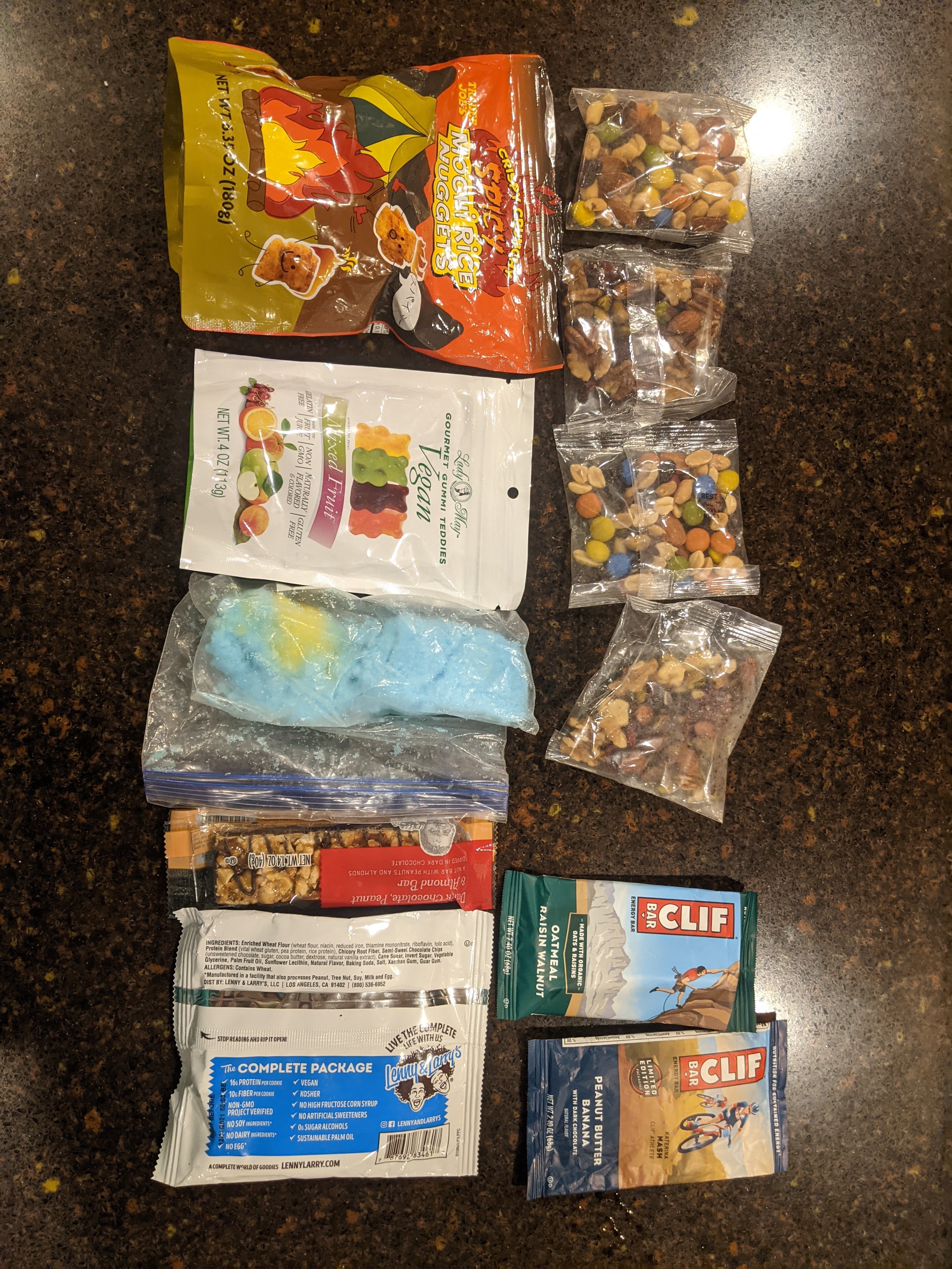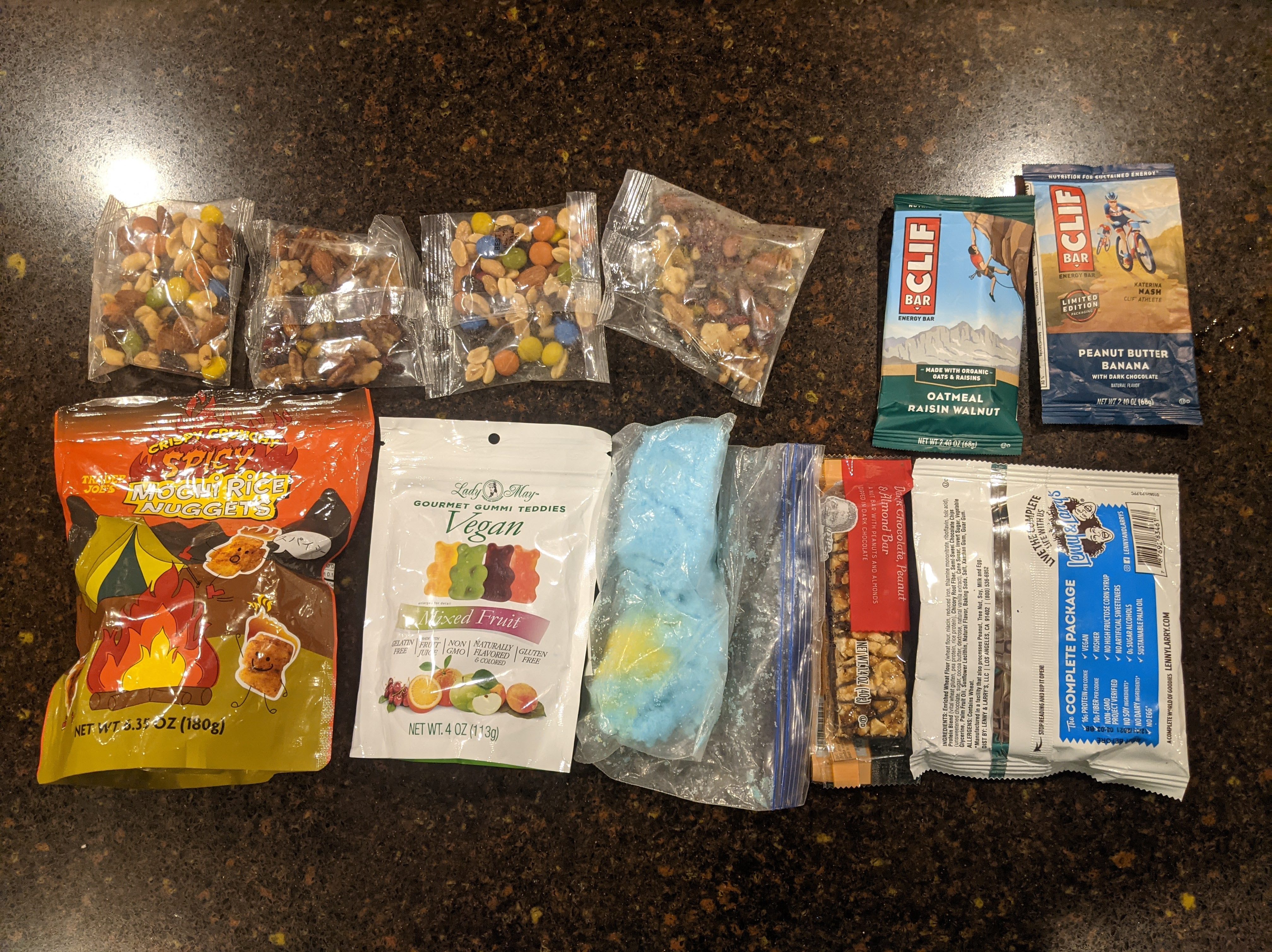 I brought a ton of food and didn’t eat it all. Not pictured are two homemade burritos (sweet potato and black bean). I tried to prioritize food I will eat, items easy to eat, and a diversity of sugary goods and savory/salty items in that order.