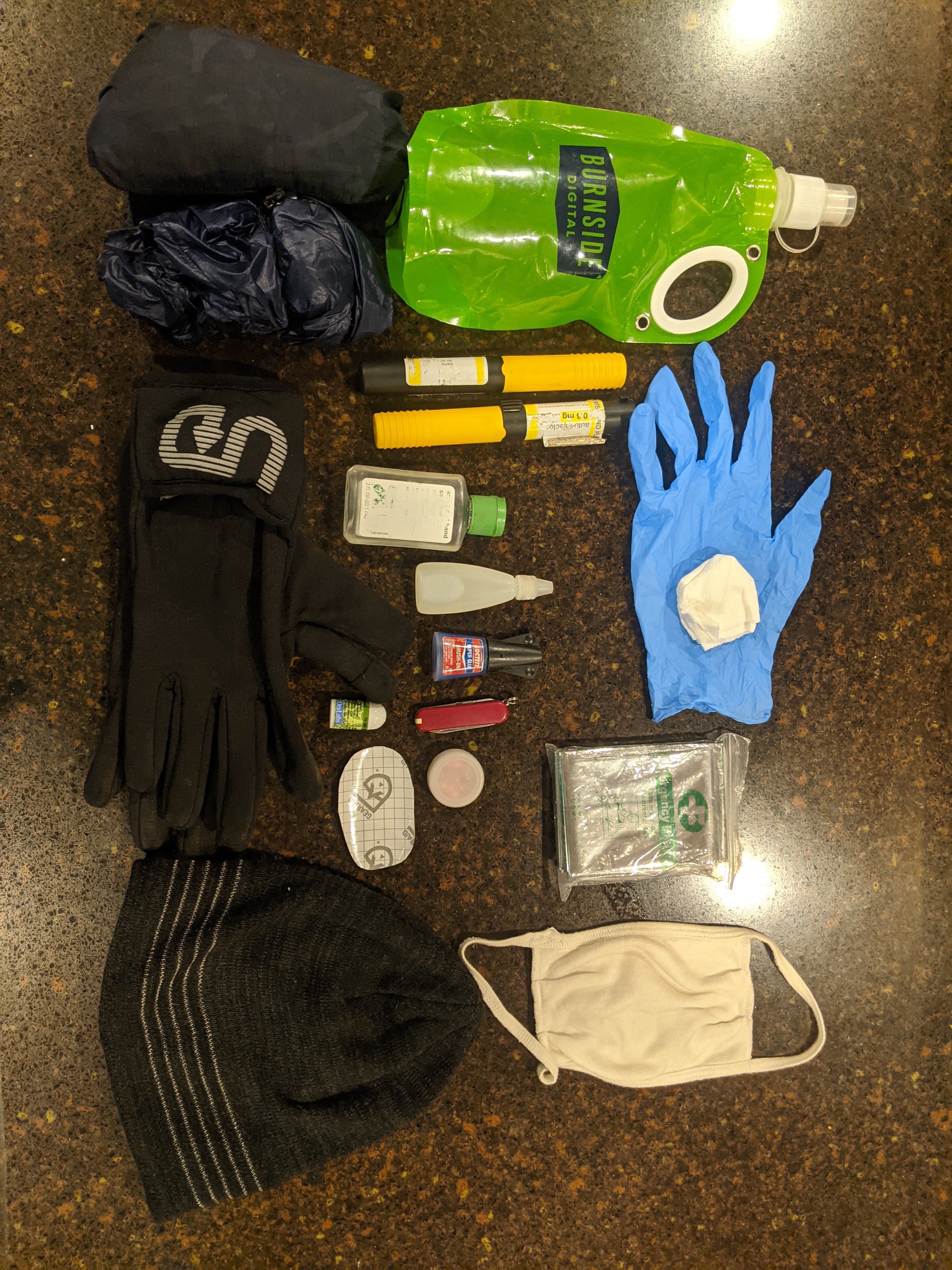 For small items I brought a variant of my typical first aid/safety kit: ibuprofen, superglue, gear tape, small knife, bleach for water purification, headlamp, space blanket, benadryl, epipens (for bee allergy), nitrile glove with TP for emergency bathroom usage, and some hand sanitizer.