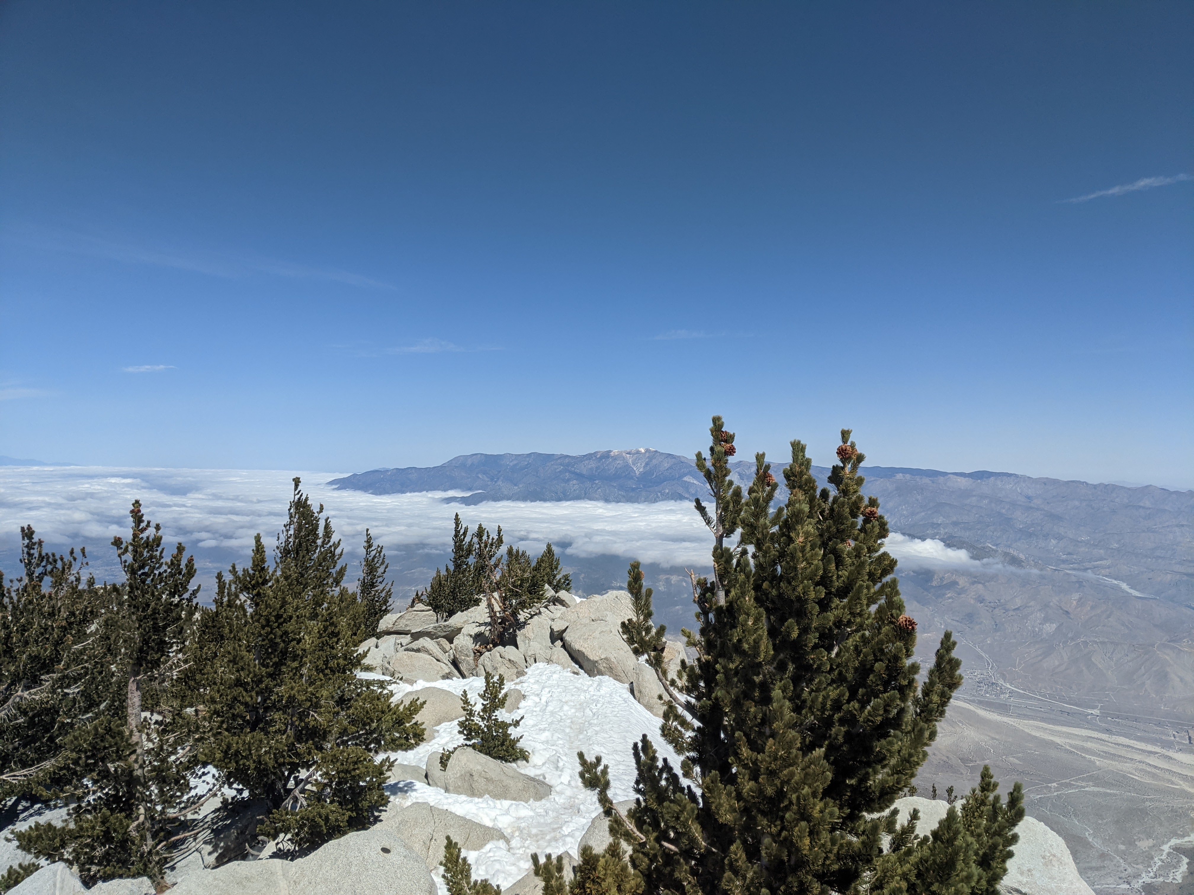A mile or so later I crossed a pleasant brook and started climbing the north facing slope up to Wellman’s divide. Finally, snow. I made quick work of the climb to Wellman’s divide, my spirit having improved while being on snow. At Wellman’s divide I saw the trail continue north up to the summit. A pleasant hour or so later I found myself in the upper snowfields below the bouldery peak. At this point I was really starting to feel the 10,000ft of vertical gain and the humbling effects of altitude. Being so close I was happy to push on. Having been kicked to the curb with altitude sickness before, I knew that my symptoms were mild. No HAPE or HACE yet, just a mild headache and a bit out of breath, though I did keep checking in with myself. Upon summiting I was nearly blown away, both figuratively and literally! The wind was fierce up there but the views were incredible spreading down into the LA basin and across the 10,000ft chasm of the Cabazon/I-10 corridor, to San Gorgonio and on to Mt. Baldy. I bundled up in most of the clothes I carried from the desert to sit down for a few minutes.