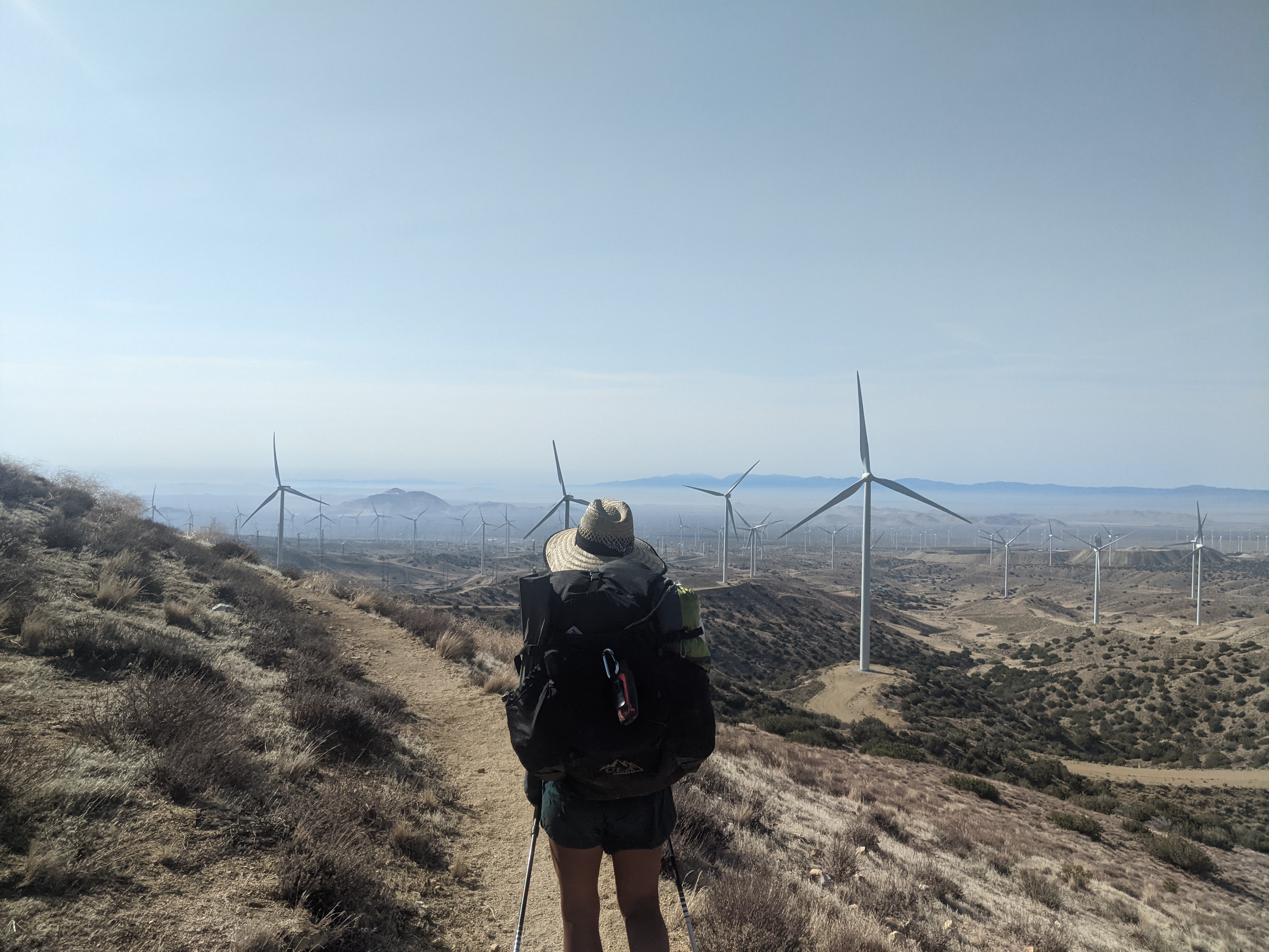 We woke up kind of tired when the sun hit our eyes after a late night of aqueduct walking. We stumbled onto the trail and hiked 1.5 miles to a water spigot that we had aimed to get to last night but fell a bit short. Shortly after we left the aqueduct and started hiking through windmills. About 6 miles after the spigot was a trickle of water from a stream. We stopped there to get some water and saw a bunch of other hikers we had hiked with the night before. They had pushed hard, some arriving at 4am that morning, and were mostly relaxing in the shade of a huge beautiful oak tree. We don’t get many big trees out here so we hung out in the shade for awhile. We chatted with some folks, three of which were from NH! And I tried to nap a bit. We took off a bit after noon and hiked through the heat of the day. I had noticed some motorcycle tracks climbing hills and crossing the trail. At one descent location we decided to run down a steep and loose scree slope. What fun!! We caught up to Amanda and sat in the shade for a bit. We then started ambling asking, picked up another hiker taking a break and had some lively discussion. At mile 449 we visited the “449 cafe” where a trail angel maintains water and some treats! What fun! We took another break then the group of hikers caught up to us. We started to feel ancy to get going and took off. We walked another 2.5hrs then hit the hay. We camped below some turbines on a bit of a windy ridge. Very cool location though!