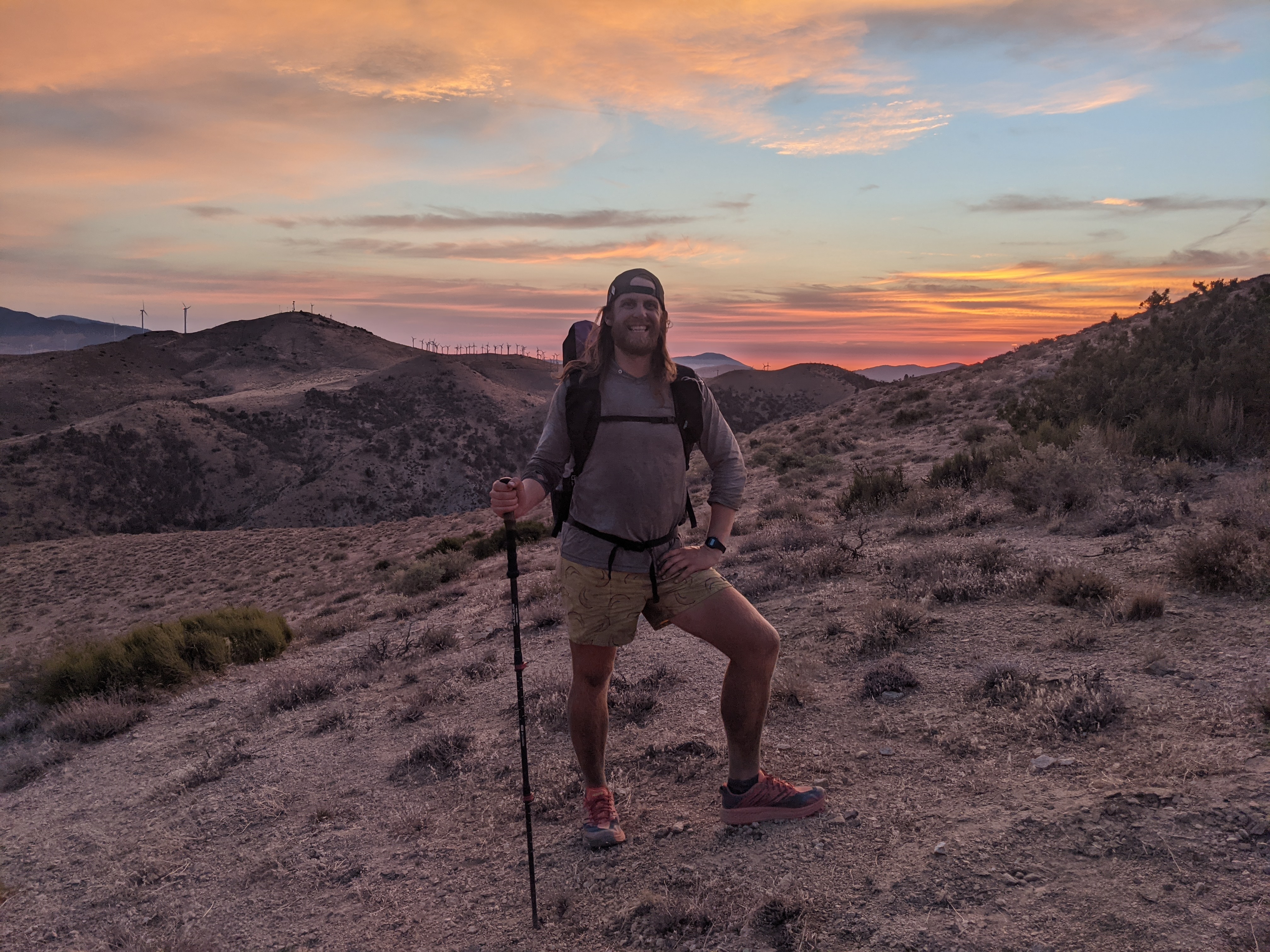 Margot and I woke up under the wind turbine and walked 3 miles to a road crossing. After the road crossing we walked through tons of turbines in the tehachapi wind farm. So many, and of all generations. It was cool to say and surprisingly beautiful. Ahhhh a walk in nature. Margot and I did 11 miles to a highway crossing to try and find a ride into town. As we got close to the overpass three other hikers were already there and dancing on the overpass to try and get trucks to honk!! I ran up and joined them and had a blast dancing and tons of trucks honked. Our timing was perfect because one of the hikers had called for a ride and 5 minutes after we arrived she was there. We all crammed in to her car and she drove us into town. We got groceries and hung out on the bench outside for a bit. Then we walked over and had delicious Thai food. After, we loitered on some excellent grass. Just like in 2017, tehachapi’s lawns are awesome!! We caught a ride out of town with another trail angel who dropped us off a bit after 6. We did about 6 more miles largely uphill and as the sun was setting the sky lit up. I was exhilarated. These are the moments that stand out to me thruhiking. Backpacking and hiking I’m not usually on trail as the sun sets, but thruhiking I am. I get to experience the trail in all it’s glory 12+ hours a day. No hiding out in a tent! I was stoked to be there. I took a number of photos and we continued hiking until finding a good tent spot. Margot Amanda and I lined up like sardines and went to bed.