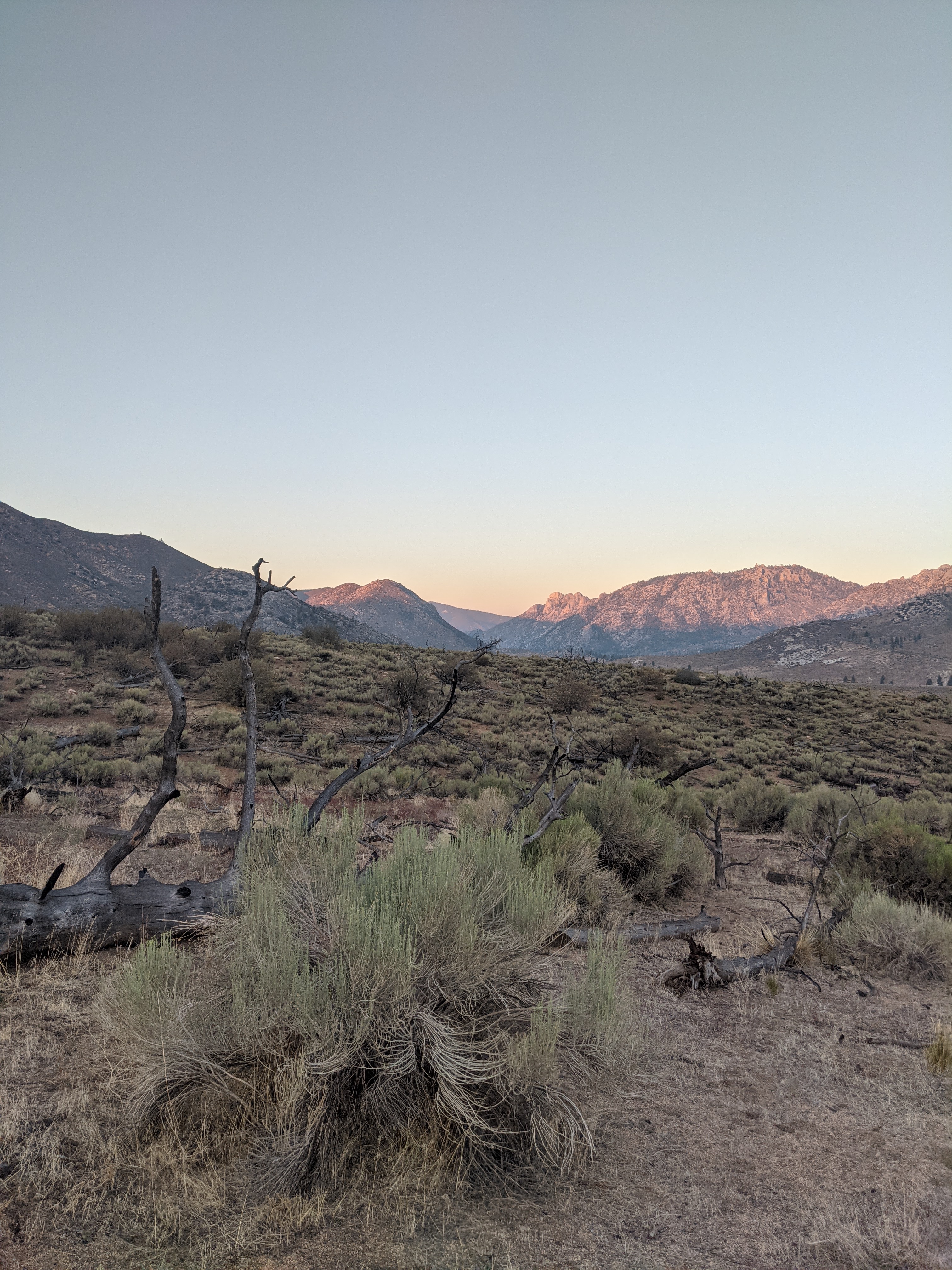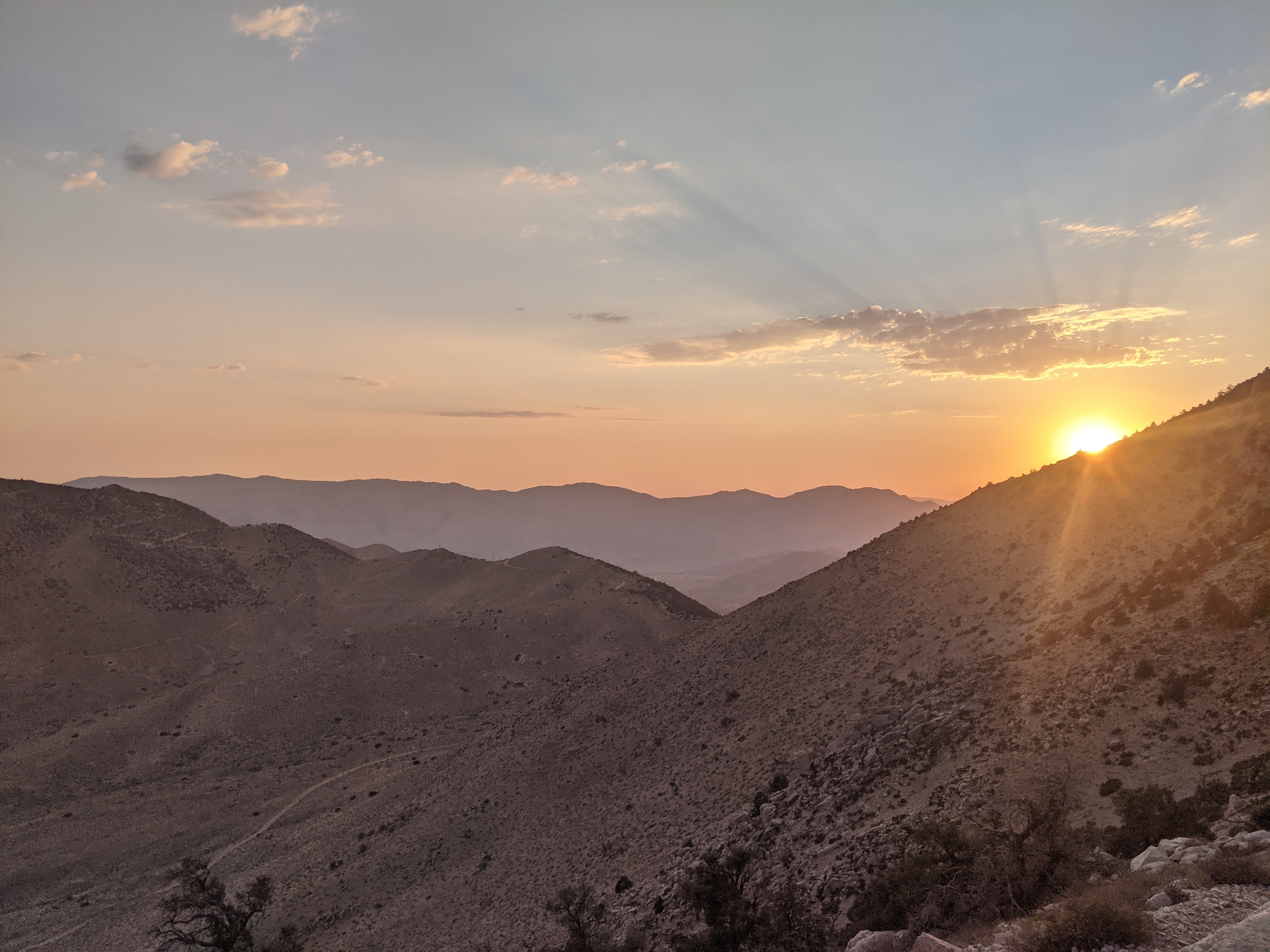 We got an even earlier start today. I was on trail just after 4:30am. A few miles in a head poked up above a log. It was Amanda! She hiked a bit further than we camped and me passing her was the impetus to get up. She packed fast and joined me on trail. We hiked for maybe an hour and a half until we reached a sweet spring. They had privies and we both used em then walked over to the water. The spring was gushing!! We took some time to fill up, eat a bit, and I finally got to wash my socks (down stream of course!). Margot showed up before too long. I rinsed my legs a bit. They were filthy. I took off, leaving Amanda and Margot to finish their chores. The trail promptly left the nice trees and began descending into the desert. Bummer. It was warning up too. 7mi in there was a sweet water cache. I chugged a liter and topped off my bottles. I met a few other hikers, chatted a bit, then took off. There was a decent climb out of the cache and I put in some grateful dead and jammed out. It was great. Awesome views, Joshua trees, and some good music. By 10, things were already getting warm out there. I hiked on, crossing dirt roads with good views all around. Around 1230 I was starting to feel the heat of the day and took a short break under a piñon pine (I think) and ate some ramen for lunch. I continued for just over an hour, passing some napping hikers until I couldn’t take the heat anymore. Another hiker was getting up to hike and I took his shade spot. His thermometer said it was 100⁰ out. Feeling drowsy, I laid down and napped in the small shade intermittently for about an hour and a half. I woke up when the shade had moved on me and I was in the sun. By then some big pooofy clouds were above and teasing the sun almost clouding out the sun. I figured it was as good of a time as any to start walking so I continued on in somewhat of a stupor. 10 minutes later I heard a familiar voice, it was Margot! She caught up to me! She was in a great mood, singing to the desert and “DJing* the “Mojave desert radio station.” I’m sure the Joshua trees appreciated the show. We hiked onto the next water cache enjoying the sudden cloud cover and a light consistent breeze, walking some ridges. We made it to the cache. It was great! Tons of water and they even had charging bricks. Wow! We hung out there, cooking dinner and drinking some water. A couple of other hikers rolled in when we were about to leave. Always hard to not chat but we had a few miles to bed. The last 4 miles were a bit of a climb to a ridge. Great sunset and nice breeze through camp which should help with sleeping in the heat. Today I drank about 3gallons of water. I was still pretty dehydrated.