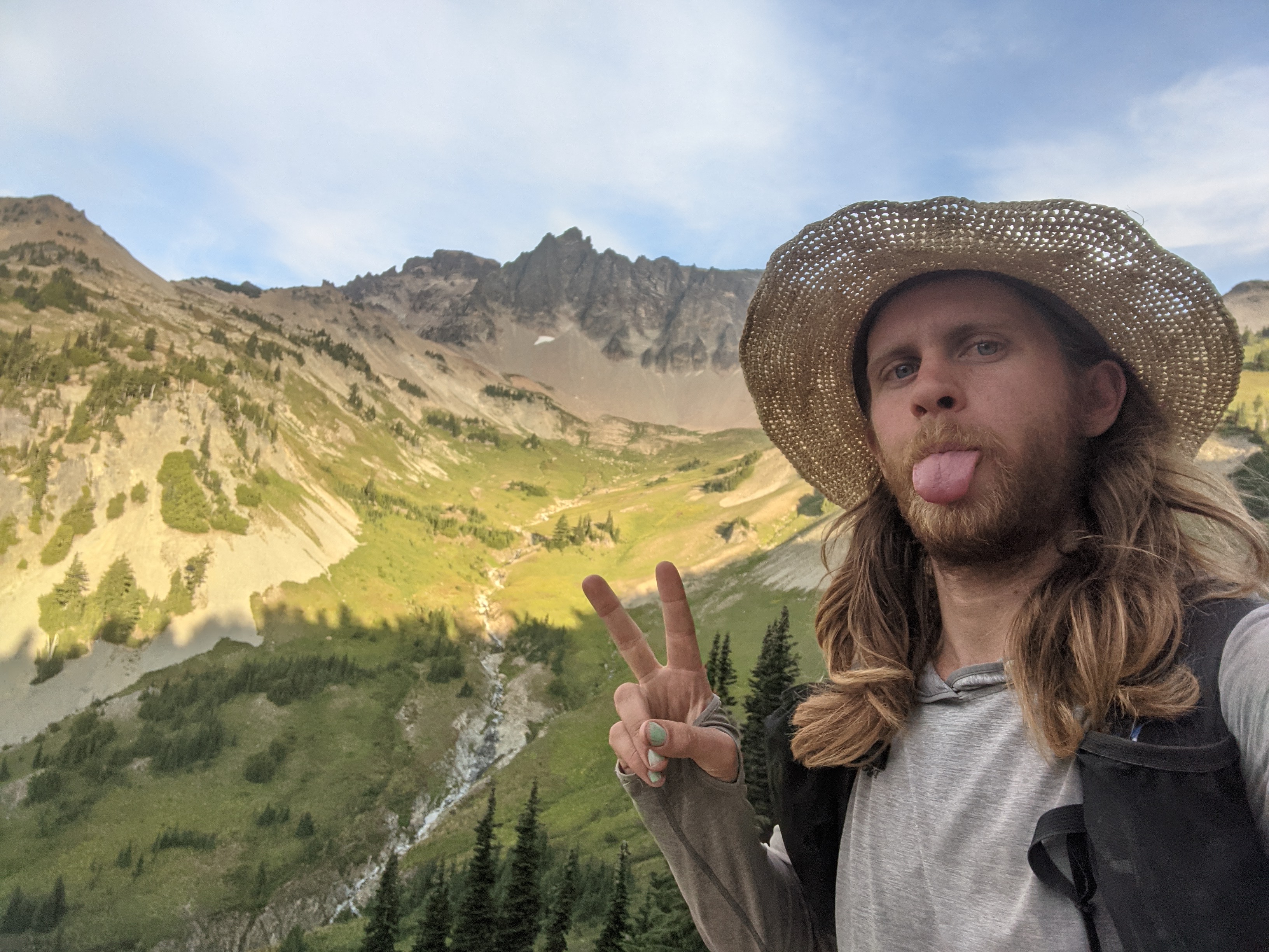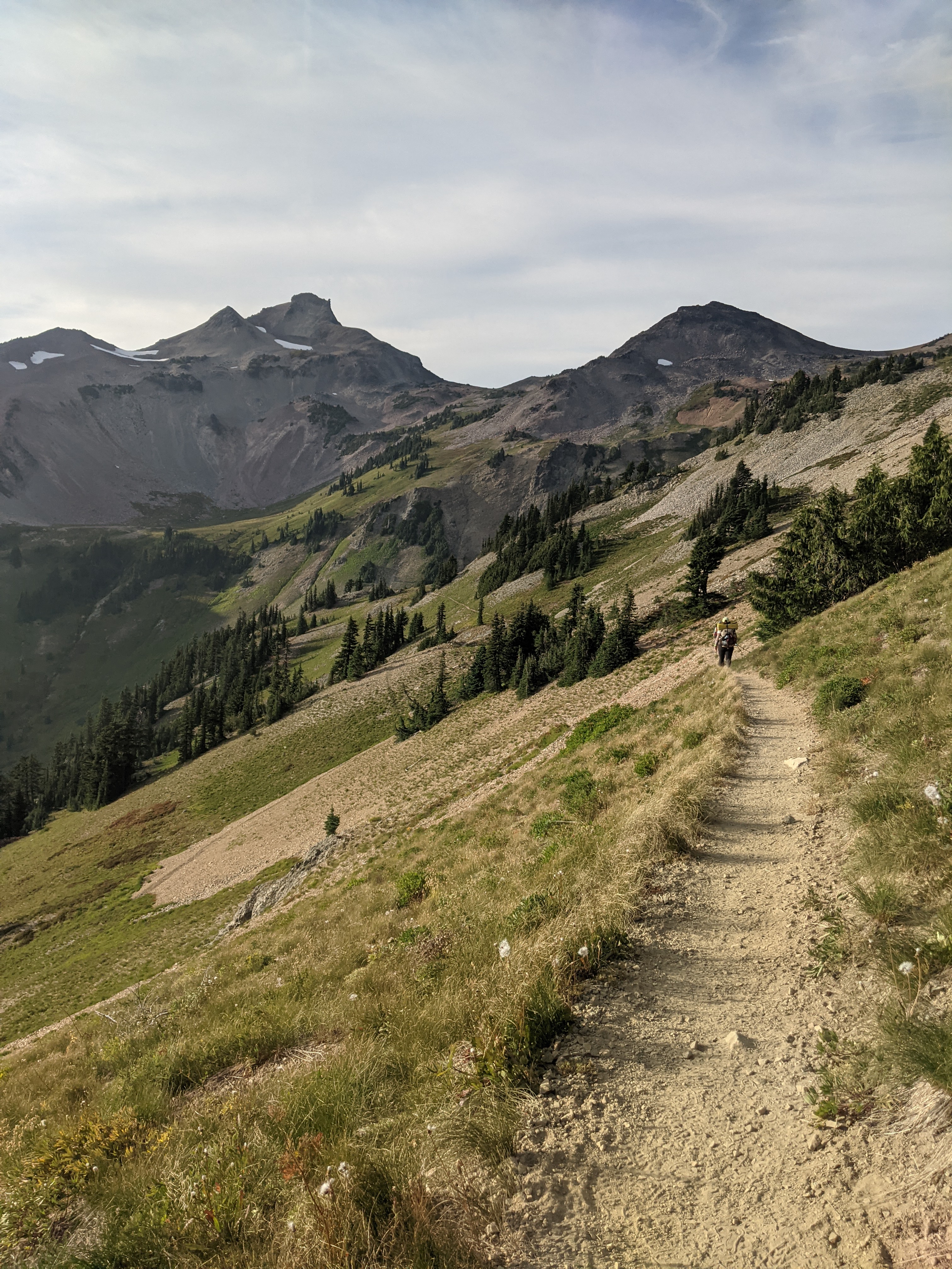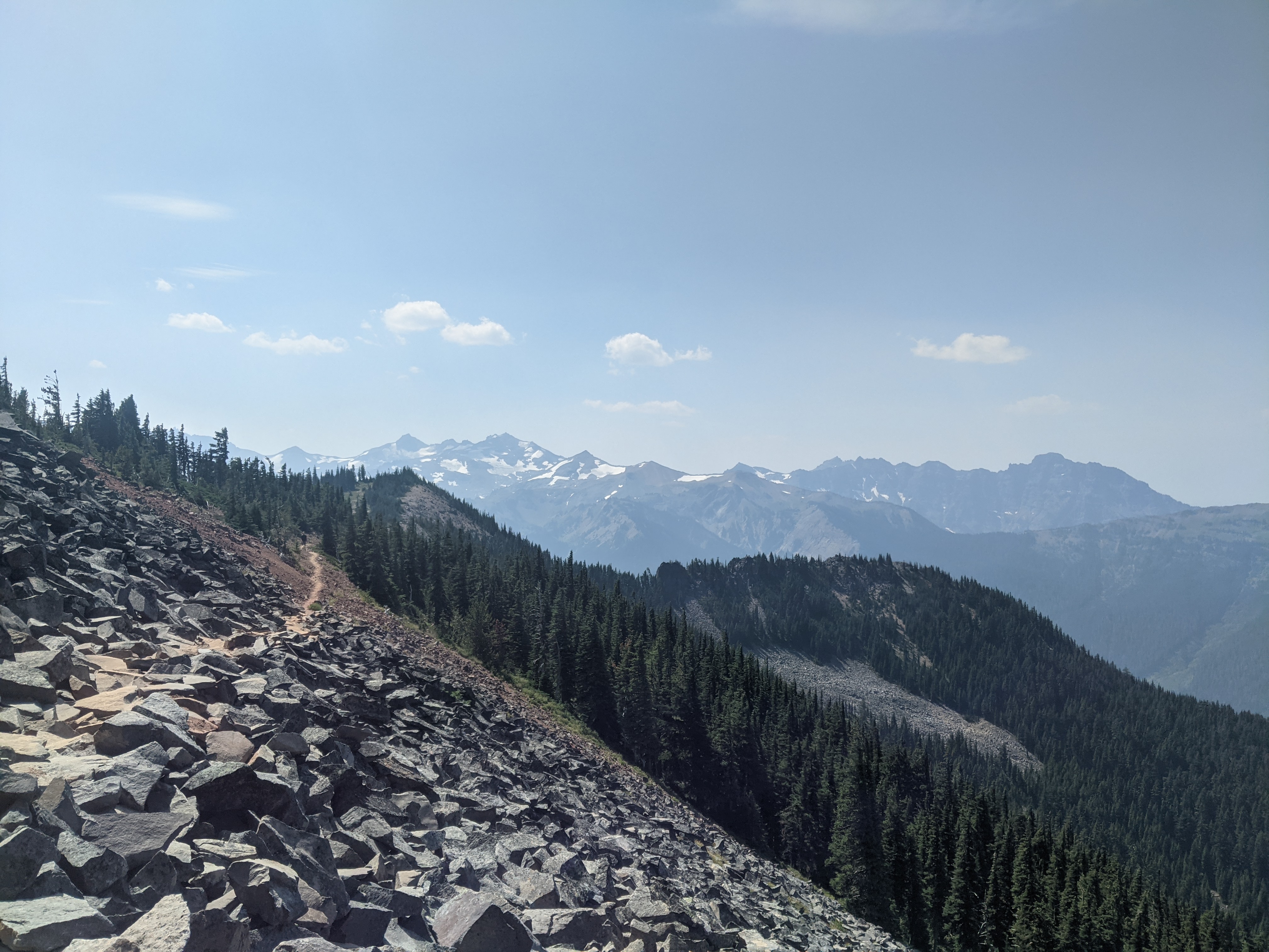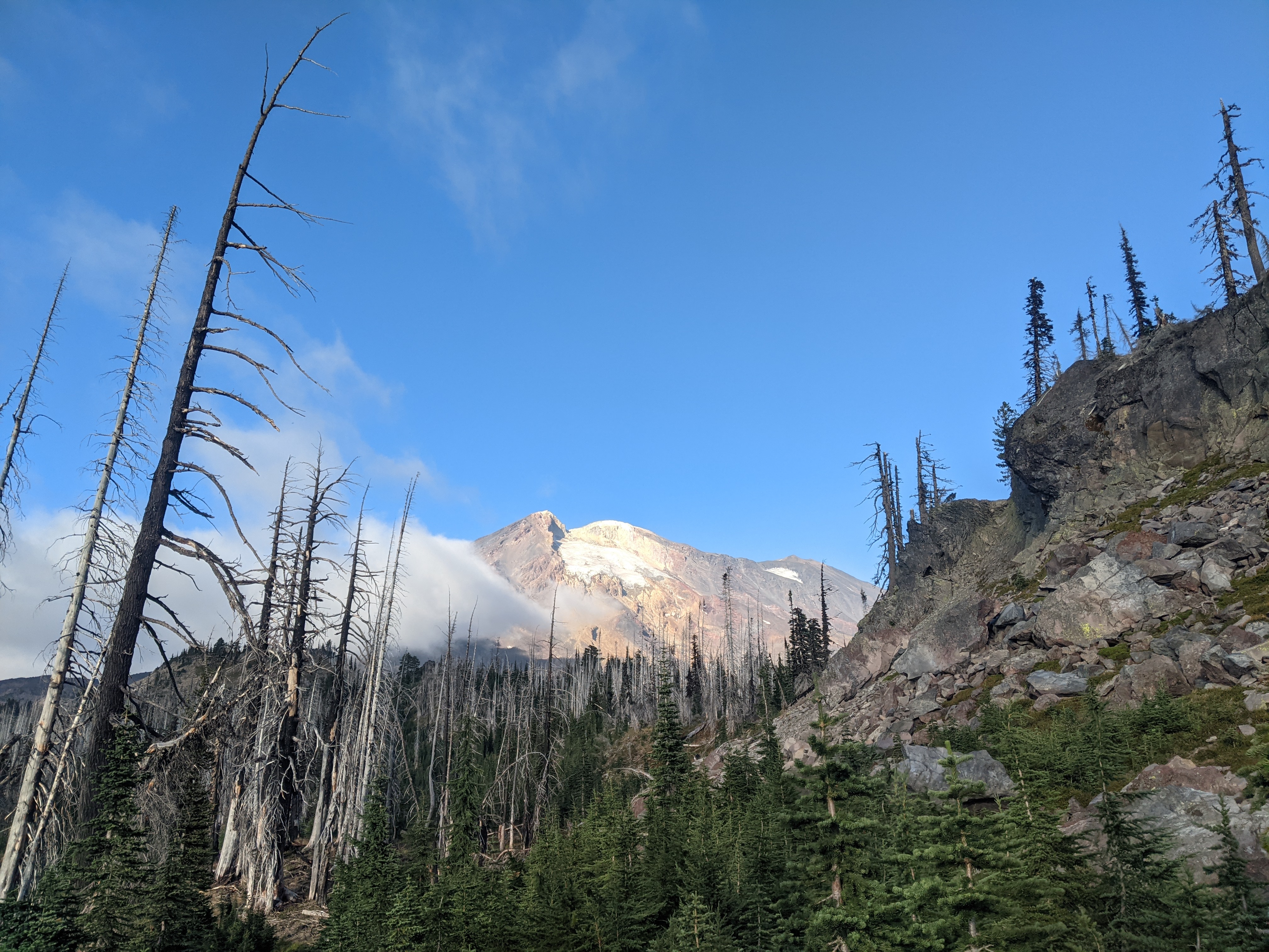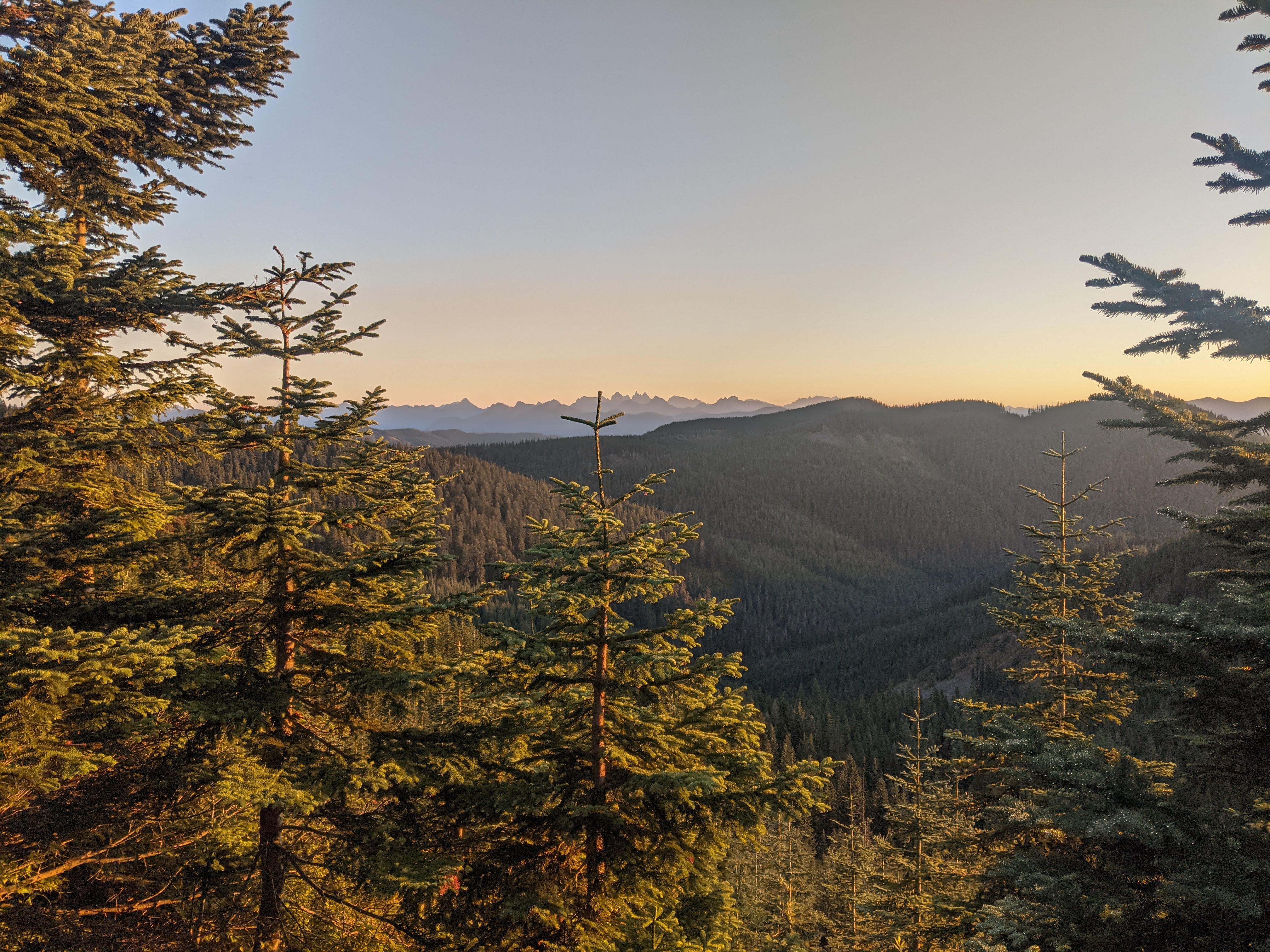 Man, I was cold again last night though I had one of the best campsites of all trail. I could see Adams and Rainier and some basins in the goat rocks. I woke up and was on trail by 7am freezing my way uphill. I took a PCT alternate up towards Old Snowy Peak then across an awesome ridge. From there I could see the backside of the Goat Rocks and the glaciers on the North side. This is the view of the Goat Rocks everyone loves. Super cool ridge walking. Maybe the best mile of PCT so far. All morning I had excellent views in all directions though some smoke covered Rainier. The trail descended gradually back into the forest leaving the high alpine of the Goat Rocks. A couple more climbs with good views and some descending lead me to white pass where I went in to resupply at the general store. I saw a few hours I knew and was offered a shower. I was show to leave, doing 2 miles out to a camp by a lake.