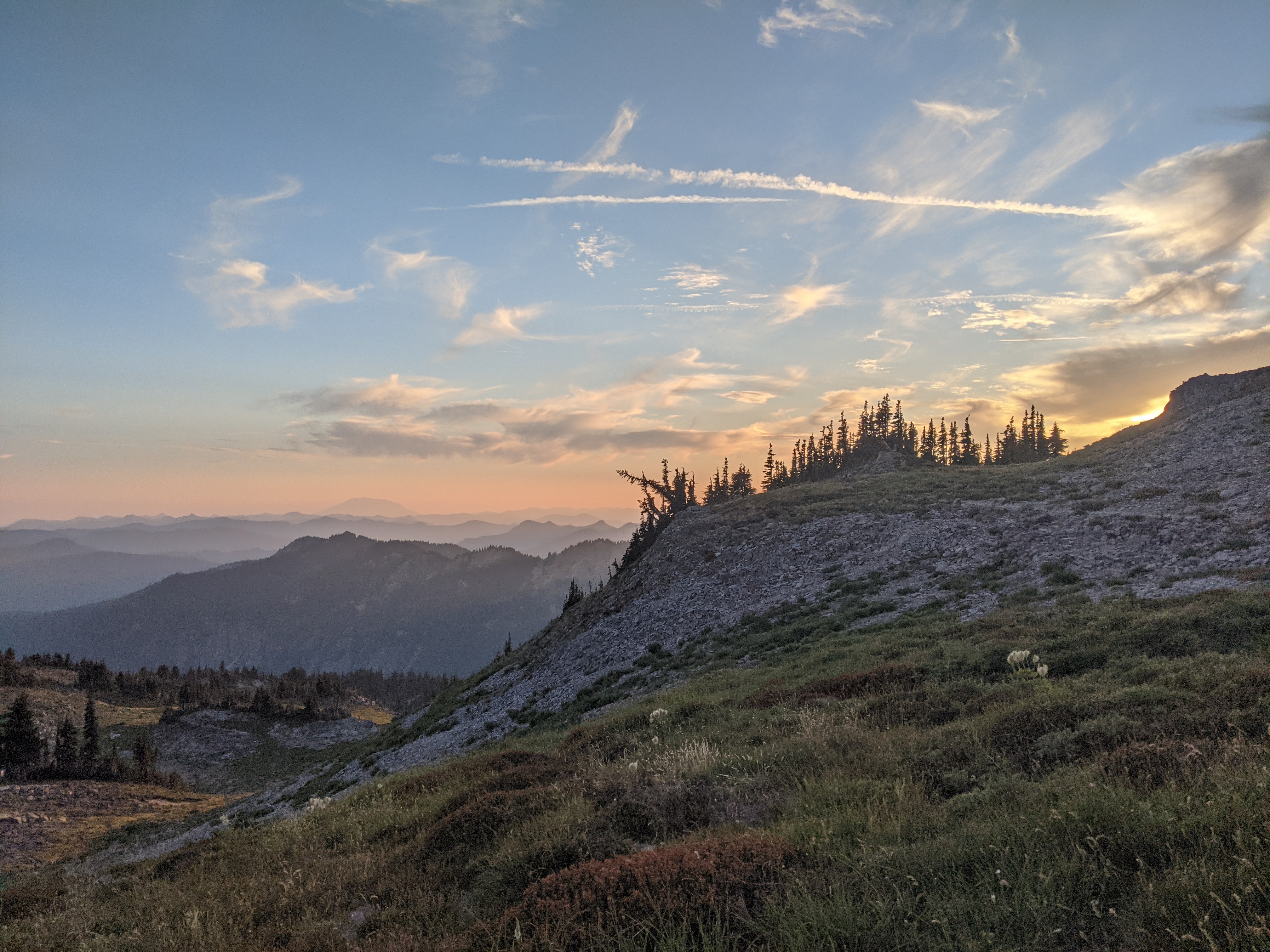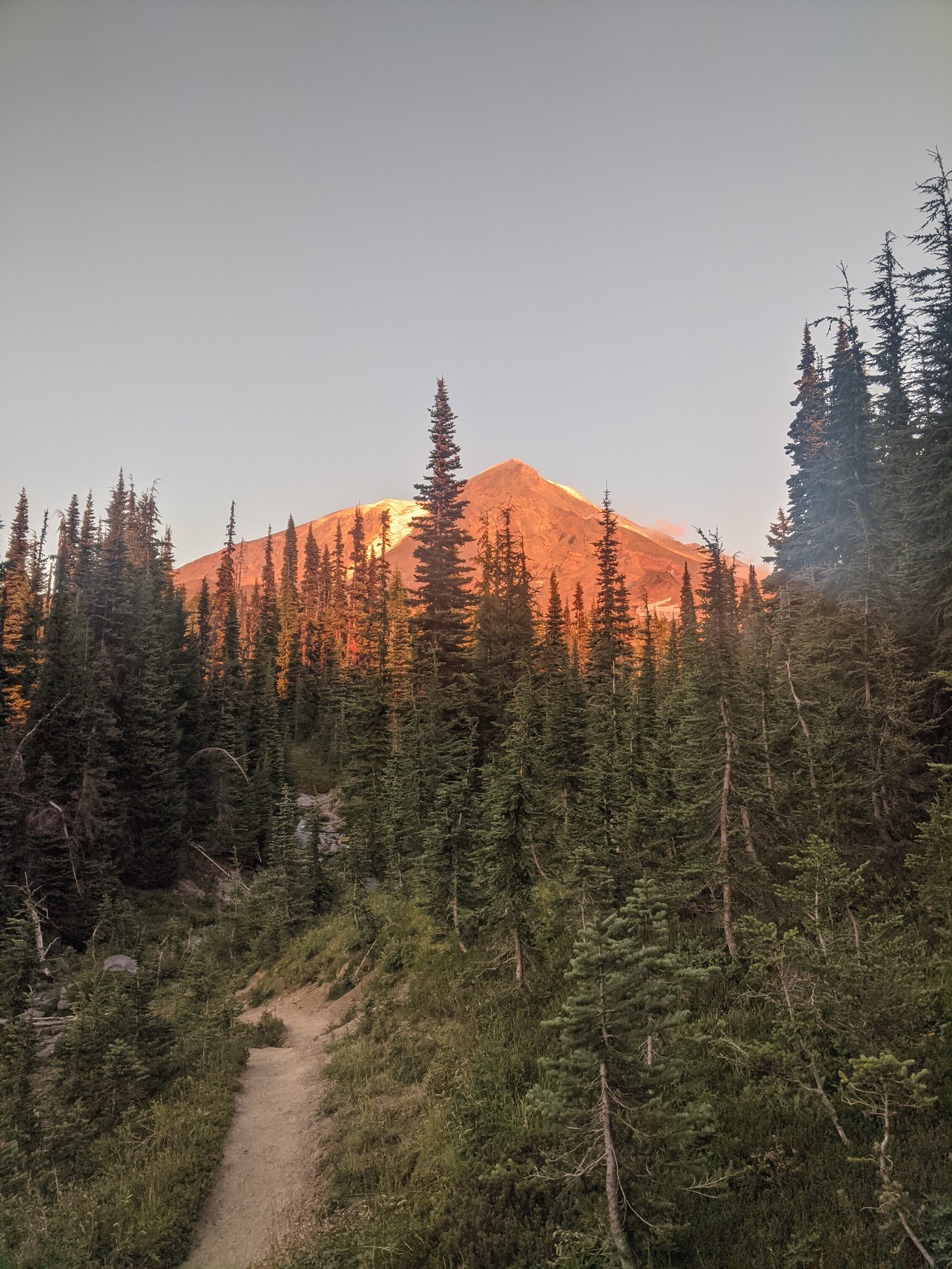 I was cold last night and wearing all my clothes. I think it was a combination of factors. My sleeping bag was a little damp from dew the previous two nights and the wet ground seemed to pull more heat away from me than normal dry ground. I neglected to be use my backpack as a ground insulator for my legs so that probably didn’t help. Tonight I will. I got a late start again, not on trail until 8:15 but it was nice sleeping in a bit. I think I’m in a sleep deficit from the travel, Osterling party, and the trail days event. Hopefully I’m caught up by now. The sun was out today, thank goodness! But I found myself wearing a few layers for quite a while still, not quite able to warm myself up. I took an alternate 3mi in that added some miles and vert to try and get a view of Mt Adams. I got a couple glimpses but unfortunately as soon as I started climbing some clouds rolled in. The rest of the day passed relatively uneventful with some walking in the forest and some berry gathering. I met a SOBO section hiker who grew up in San Diego and went to Grossmont! I dried my stuff out 18mi in in a big meadow, which should help me sleep warm tonight. I opted out of Trout Lake today and I’m pushing on to White Pass. I climbed the western flanks of Mt Adams and found myself dragging and distracted by the berry bushes. I had excellent views of the alpenglow on Adams, cloaked in orange and now I’m falling asleep tucked away on a knoll. Off in the way distance I can hear some rockfall.