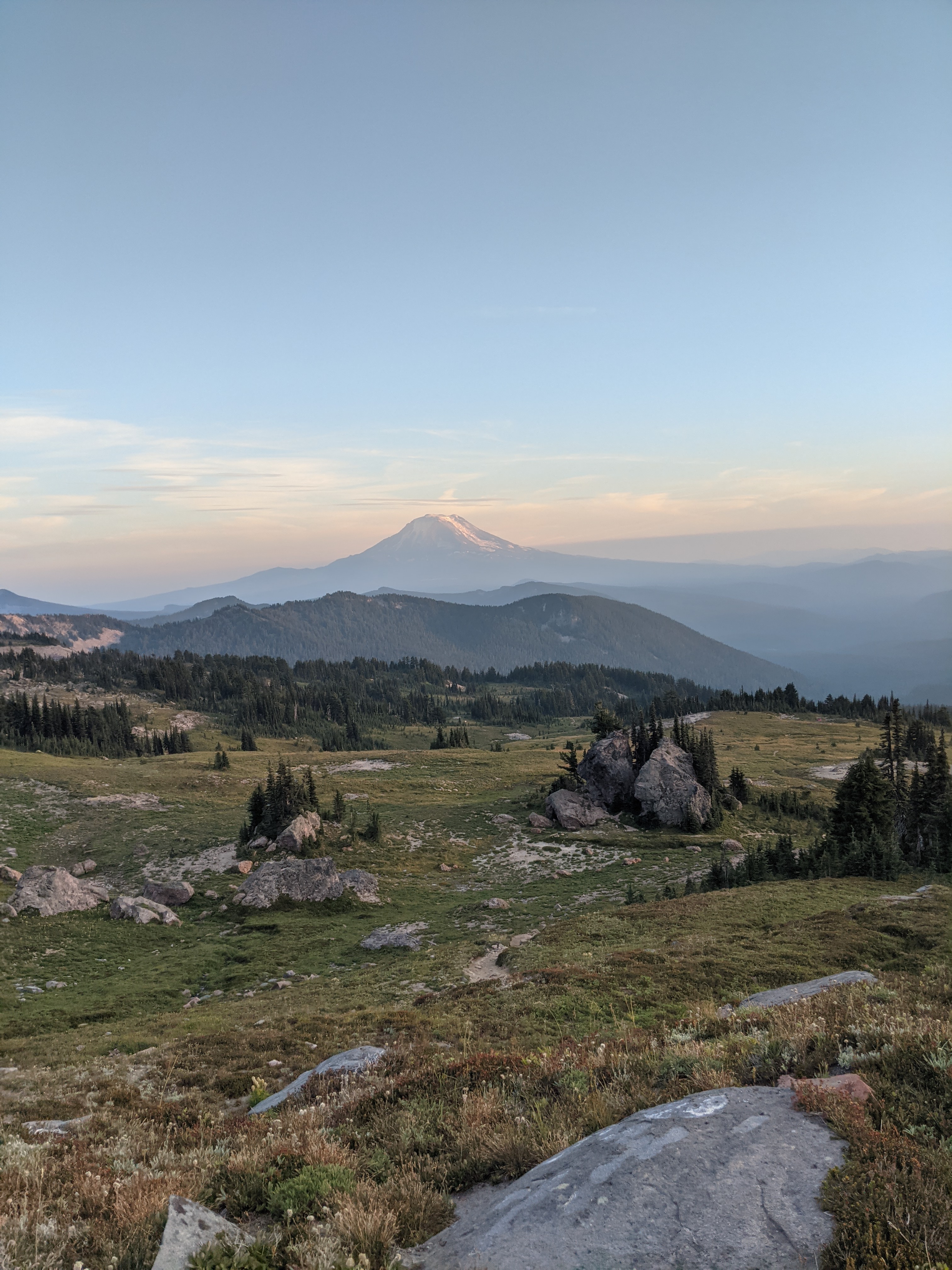 Cold night last night. Pulled all the stops and was still chilly. Good campsite location helped me though. In the morning there was frost on the ground and ice on some rocks near the river. Wore a lot of clothes for a couple hours in the morning. Walking around Mt Adams was awesome this morning, aglow in orange with big glaciers on the side. Some beautiful meadows and flowers around it too. About 8mi in, a thru hiker was taking a break from hiking and making pancakes from a van. Sweet trail magic!! There was also a very cute lovable puppy there named Olive. I love Olive. Met a couple hikers and one I recognized from earlier in the trail. He put it together and I met him way back at Kennedy Meadows resort, around mile 1000. We hiked a bit and chatted. I found myself slowing down in the afternoon and took a break to dry my sleeping bag. Tons of berry bushes today. I then climbed up to Cispus Pass and had great views of the goat rocks. Super cool section with views of Adams, the rocks, and later Rainer. Awesome sunset and lighting of the rocks. I Hiked about 4.5mi beyond the pass and I’m camping exposed. Calm night but I think it’s going to get cold again. Chatted with a weekend hiker named Josha for an hour and a half. Cool guy!